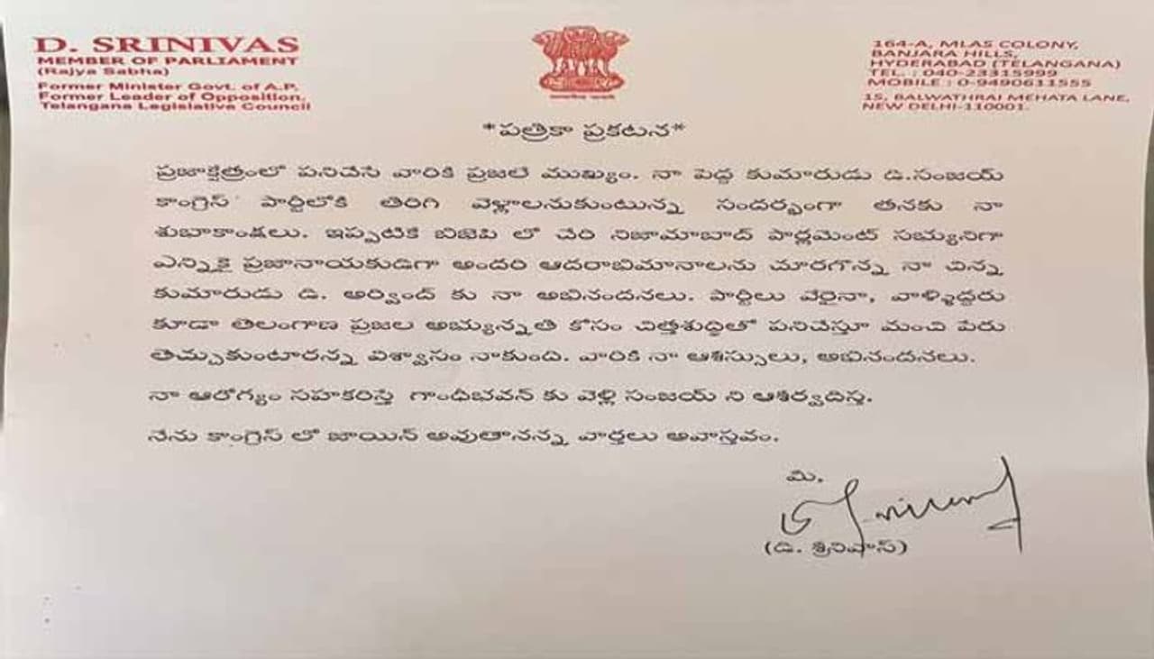 ఈ లేఖ మీడియాకు విడుదల చేసిన కొద్ది సేపటికే గాంధీ భవన్ కు పెద్ద కొడుకు సంజయ్ తో కలిసి డి.శ్రీనివాస్ గాంధీ భవన్ కు చేరుకున్నారు. ఈ సందర్భంగా డి.శ్రీనివాస్ మీడియాతో మాట్లాడారు. తాను కాంగ్రెస్ పార్టీలో చేరనున్నట్టుగా తెలిపారు.