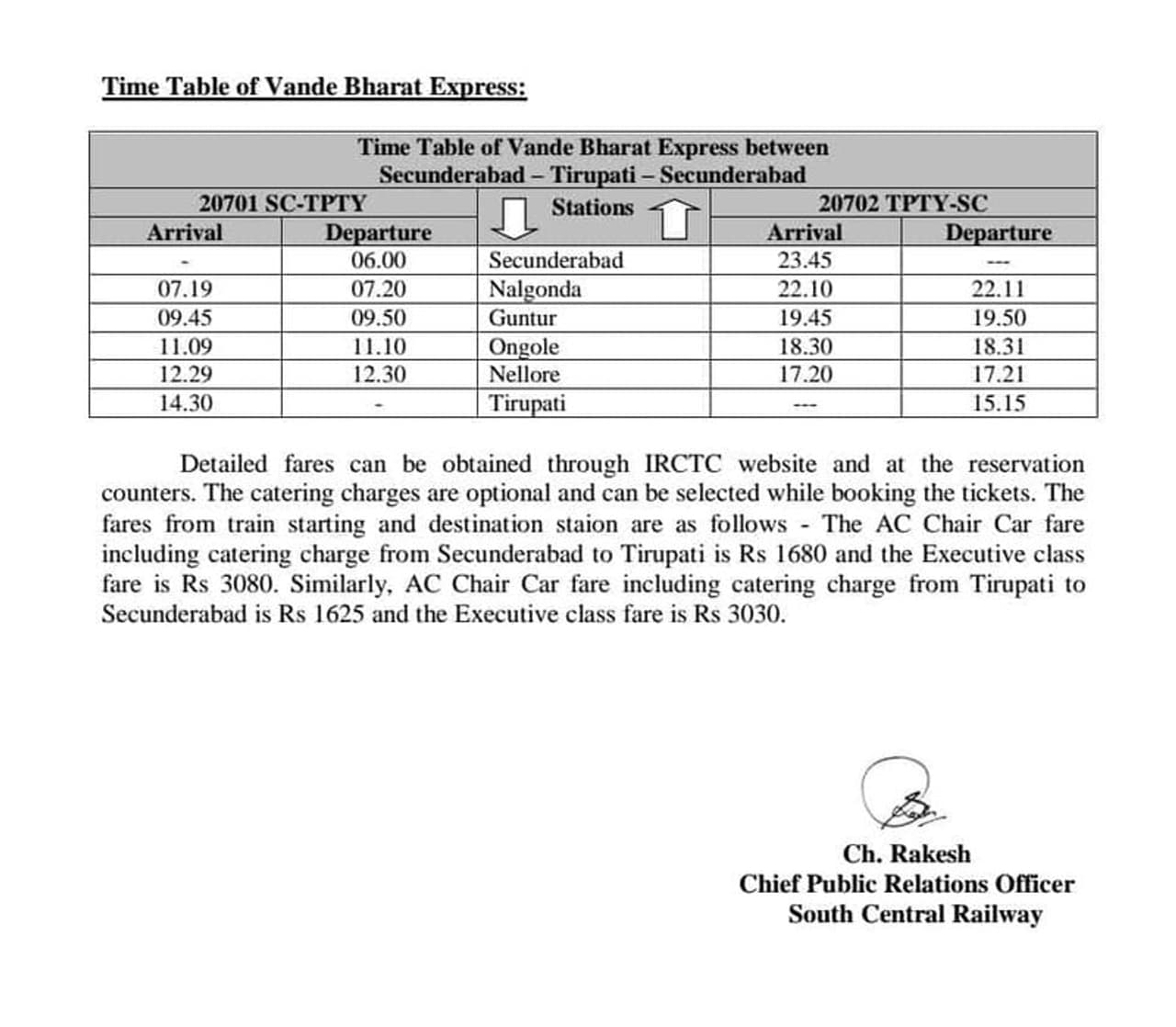 ఉదయం 6 గంటలకు సికింద్రాబాద్-తిరుపతి వందేభారత్ ఎక్స్ప్రెస్ రైలు సికింద్రాబాద్ నుంచి బయలుదేరుతుంది. ఉదయం 7.19 గంటలకు నల్లగొండకు, 9.45 గంటలకు గుంటూరుకు చేరుకుంటుంది. ఉదయం 11.09 గంటలకు రైలు ఒంగోలు చేరుకుంటుంది. 11.29 గంటలకు నెల్లూరు చేరుకుంటుంది. 2.30 నిమిషాలకు తిరుపతి చేరుకుంటుందని రైల్వే శాఖ ఒక ప్రకటనలో తెలిపింది.
