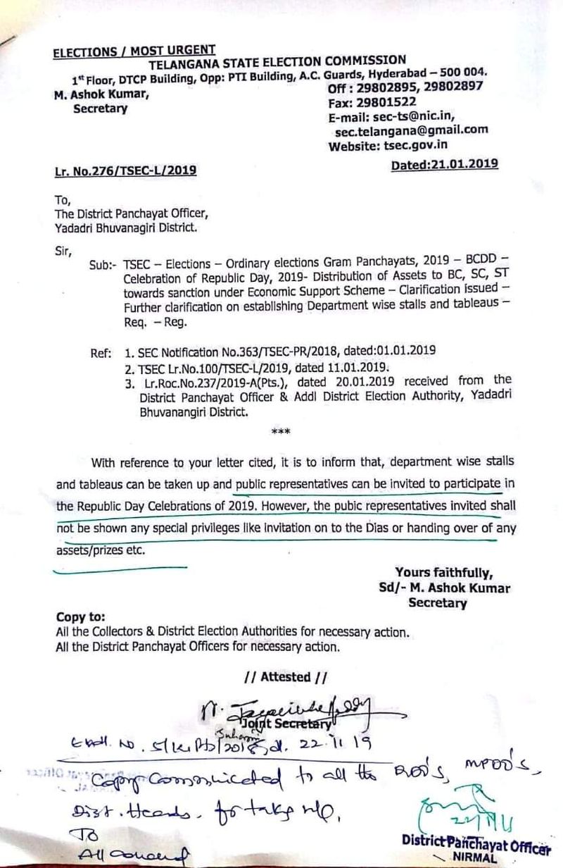 అందువల్ల గ్రామాల్లో ప్రభుత్వ ఆద్వర్యంలో జరిగే గణతంత్ర వేడుకల్లో నూతన సర్పంచ్ లను ప్రత్యేకంగా ఆహ్వానించరాదని ఈసీ పేర్కొంది. అంతేకాకుండా వేదికపైకి ఆహ్వానించడం, బహుమతులను వారి చేతుల మీదుల అందించడం, జాతీయ పతాకాన్ని ఆయన చేత ఆవిష్కరింపజేయడం వంటివి చేయరాదని అధికారులను సూచించింది.