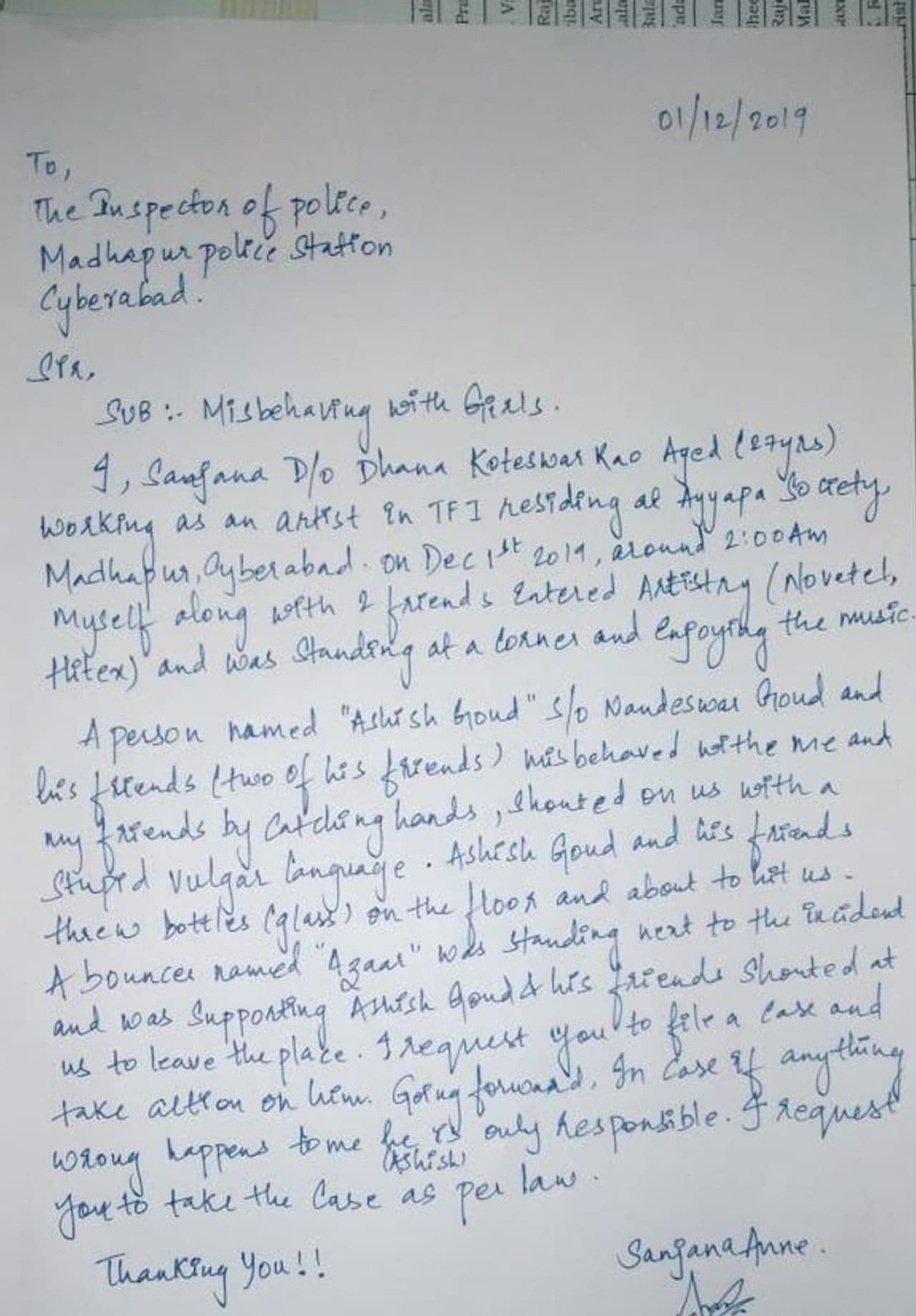 బిగ్ బాస్ ఫేమ్ సంజన కంప్లయింట్ లో అశీష్గౌడ్, అతని స్నేహితులు తమతో అసభ్యంగా ప్రవర్తించారని సంజన పేర్కొంది. తాను, తన స్నేహితురాళ్ళు మ్యూజిక్ ఎంజాయ్ చేస్తుండగా ఆశిష్ రెడ్డి, అతని స్నేహితులు చేతులు పట్టుకొని వెకిలి వేషాలు వేశారని ఆమె తెలిపింది.
