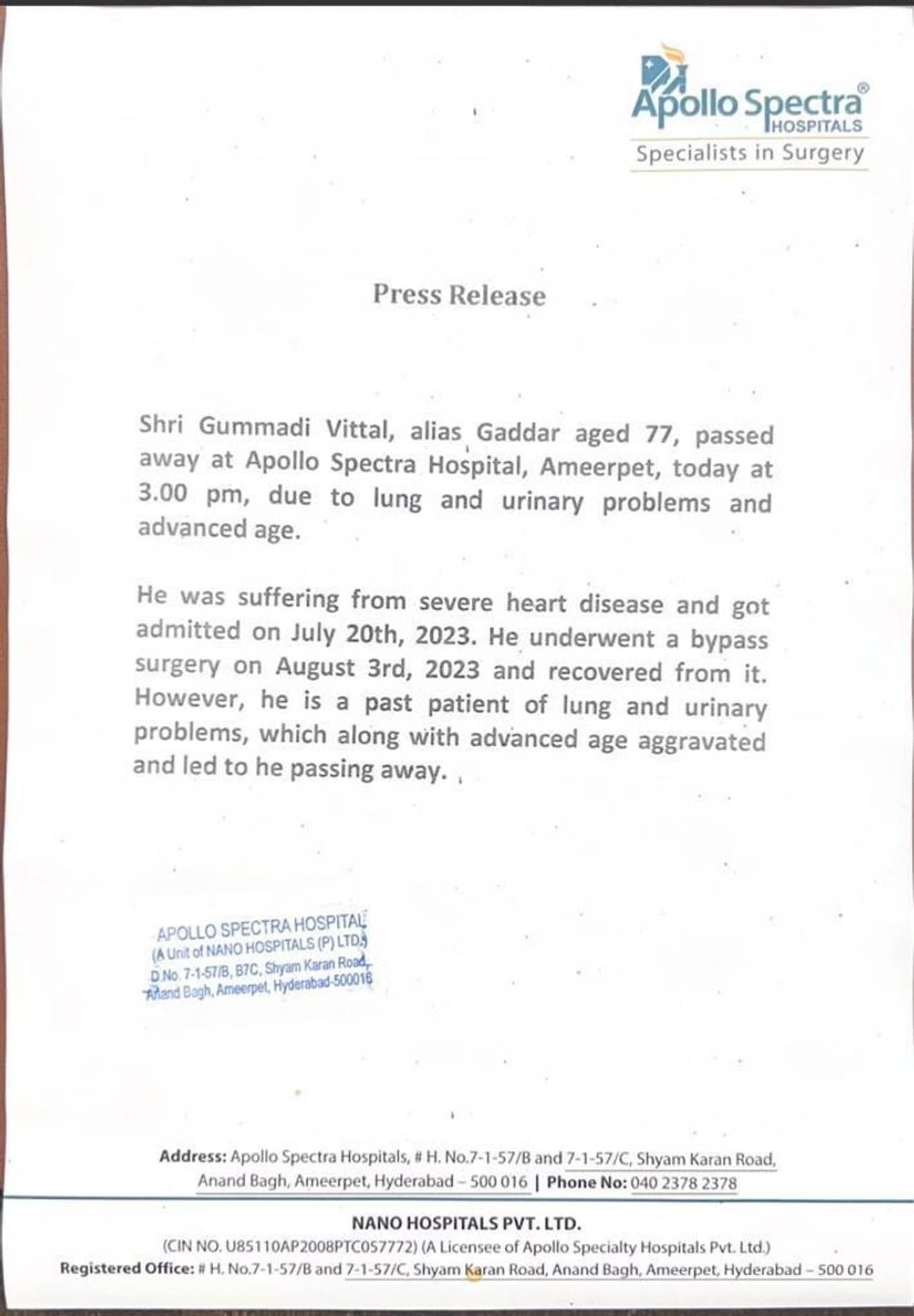 గద్దర్ మృతిపై అపోలో స్పెక్ట్రా ఆస్పత్రి కూడా ప్రకటన విడుదల చేసింది. అమీర్పేటలోని అపోలో స్పెక్ట్రా ఈరోజు మధ్యాహ్నం 3 గంటలకు గద్దర్ తుదిశ్వాస విడిచినట్టుగా పేర్కొంది. లంగ్స్, యూరీనరీ సమస్యలతో ఆయన బాధపడుతున్నట్టుగా తెలిపింది. ఇక, ఈ నెల 20 గుండె సంబంధిత అనారోగ్యంతో గద్దర్ ఆస్పత్రిలో చేరినట్టుగా పేర్కొంది. ఆగస్టు 3వ తేదీన ఆయన బైపాస్ సర్జరీ చేయడం జరిగిందని.. దాని నుంచి కోలుకున్నారని తెలిపింది. అయితే ఆయన గతంలో ఊపిరితిత్తులు, మూత్ర సంబంధిత సమస్యలతో బాధపడుతున్న వ్యక్తి కావడం, వయసు పైబడటం వంటివి ఆయన మరణానికి దారితీశాయని పేర్కొంది.