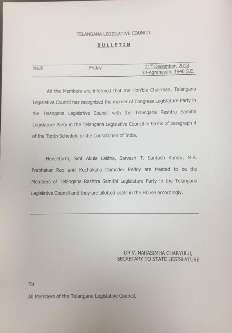దీంతో నలుగురు కాంగ్రెస్ పార్టీ ఎమ్మెల్సీలను టీఆర్ఎస్ఎల్పీలో విలీనం చేస్తూ నిర్ణయం తీసుకొన్నారు. ఈ మేరకు శుక్రవారం నాడు సాయంత్రం శాసనమండలి సెక్రటరీ బులెటిన్ విడుదల చేశారు.