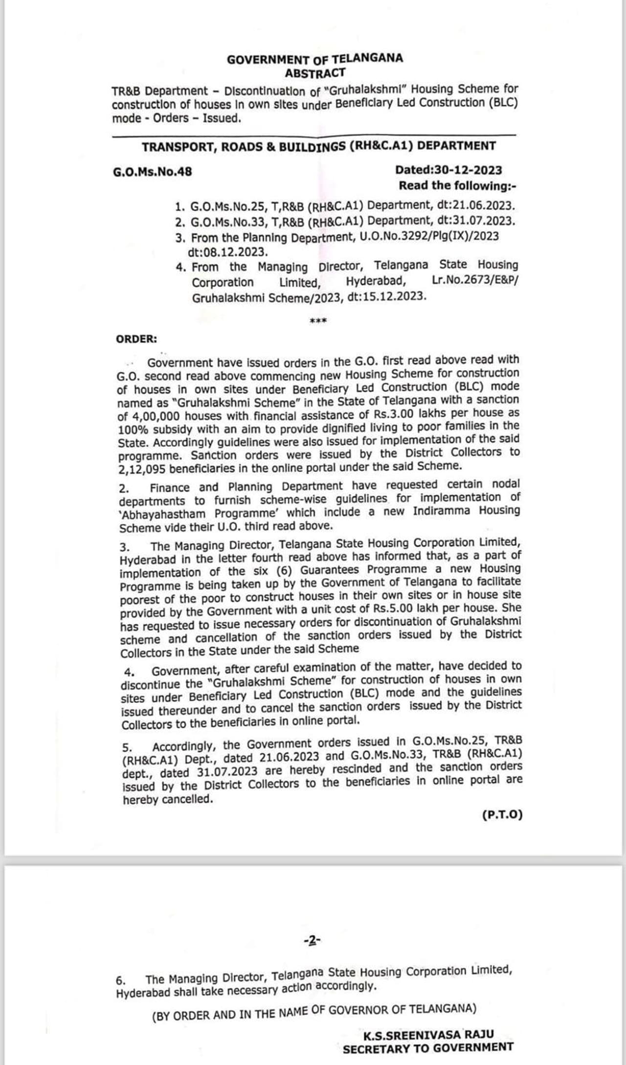 గృహలక్ష్మీ పథకం కింద మంజూరైన ఇళ్ల పరిస్థితి ఏమిటీ? ప్రొసీడింగ్స్ వచ్చిన ఇళ్లకు గృహలక్ష్మీ కింద ఆర్థిక సహాయం అందుతుందా? మళ్లీ ఇందిరమ్మ పథకానికి దరఖాస్తు చేసుకోవాలా? ఈ సందేహాలకు సంబంధించి శనివారం రాష్ట్ర ప్రభుత్వం స్పష్టత ఇచ్చింది. గృహలక్ష్మీ పథకం, ఆ పథకం కింద కలెక్టర్లు జారీ చేసిన శాంక్షన్ ఆర్డర్స్ రద్దు చేస్తూ ఆదేశాలిచ్చింది.