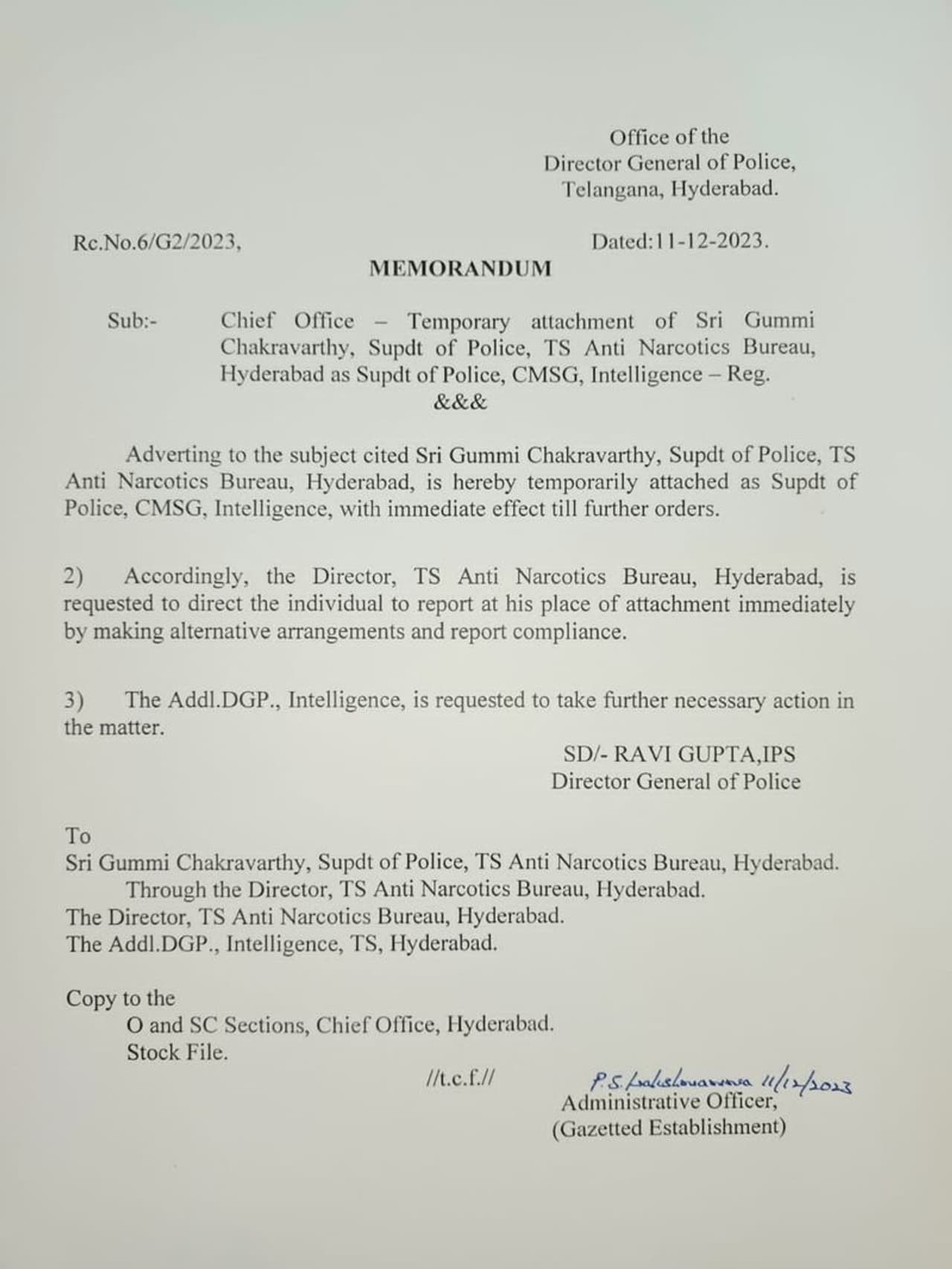 హైదరాబాద్ : తెలంగాణ ముఖ్యమంత్రి రేవంత్ రెడ్డి చీఫ్ సెక్యూరిటీ ఆఫీసర్ గా గుమ్మి చక్రవర్తి నియమితులయ్యారు. రాష్ట్ర యాంటి నార్కోటిక్ బ్యూరో ఎస్పీగా వున్న చక్రవర్తిని తాత్కాలికంగా సీఎం సెక్యూరిటీ ఆఫీసర్ గా నియమిస్తూ రాష్ట్ర డిజిపి రవిగుప్తా ఉత్తర్వులు జారీచేసారు. ఈ నిర్ణయం తక్షణమే అమల్లోకి వస్తుందని... తదుపరి ఆదేశాలు వెలువడేవరకు సీఎం సెక్యూరిటీ బాధ్యతలు చక్రవర్తి చూసుకుంటారని ఉత్తర్వుల్లో పేర్కొన్నారు.
