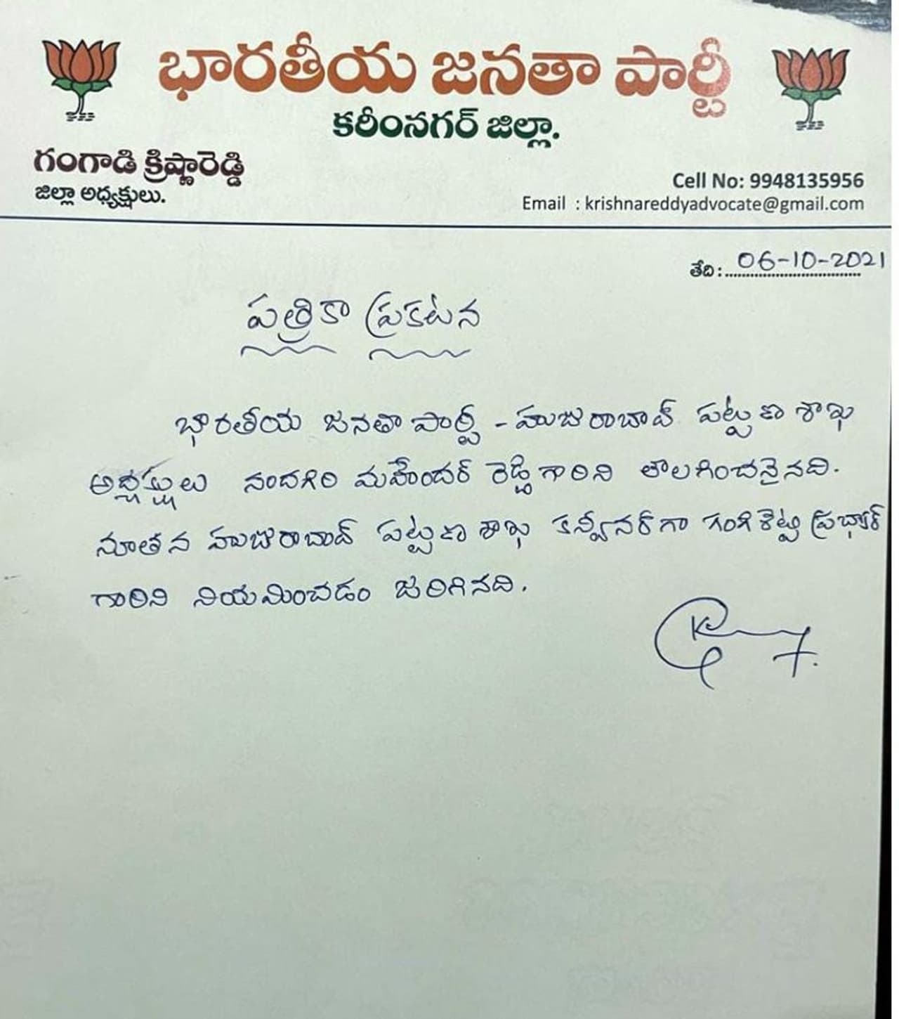 కరీంనగర్: హుజురాబాద్ ఎన్నికల పోలింగ్ కు సమయం దగ్గరపడుతున్న సమయంలో భారతీయ జనతా పార్టీలో కలకలం రేగింది. హుజురాబాద్ పట్టణ బిజెపి అధ్యక్షుడు నందగిరి మహేందర్ రెడ్డిని తొలగించారు. ఈ మేరకు కరీంనగర్ జిల్లా అధ్యక్షులు గంగాడి క్రిష్ణారెడ్డి పేరిట ఓ ప్రకటన వెలువడింది. నూతనంగా హుజురాబాద్ పట్టణ బిజెపి శాఖ కన్వీనర్ గా గంగిశెట్టి ప్రభాకర్ ను నియమించినట్లు జిల్లా అధ్యక్షులు ప్రకటించారు.