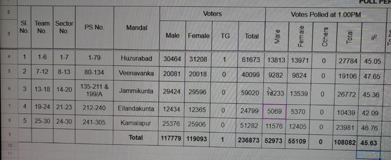 హుజురాబాద్ నియోజకవర్గంలో మండలాలవారిగా పోలింగ్ శాతం