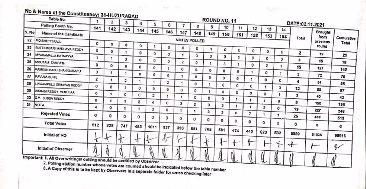 పదకొండో రౌండ్ ముగిసేసరికి బిజెపి అభ్యర్థి ఈటలకు 48,588 ఓట్లు, టీఆర్ఎస్ అభ్యర్థి గెల్లు శ్రీనివాస్ యాదవ్ కు 43,324 ఓట్లు వచ్చాయి. కాంగ్రెస్ పార్టీ అభ్యర్థి బల్మూరి వెంకట్ కు కేవలం 2524 ఓట్లు మాత్రమే వచ్చాయి. కేవలం 11వ రౌండ్లో బిజెపికి 3941, టీఆర్ఎస్ కు 4308 ఓట్లు వచ్చాయి.