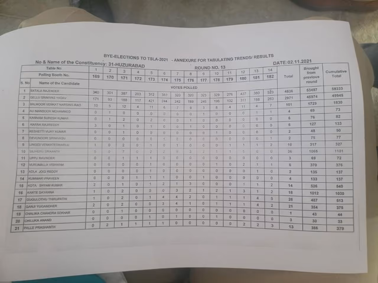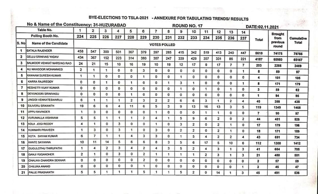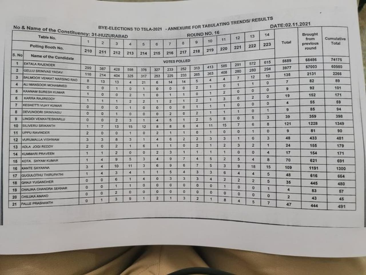 15వ రౌండ్ ముగిసేసరికి ఈటల పోటీచేసిపి బిజెపికి 68,586 ఓట్లు, గెల్లు శ్రీనివాస్ యాదవ్ పోటీచేసిన టీఆర్ఎస్ కు 57,003, కాంగ్రెస్ 1982 ఓట్లు వచ్చాయి.