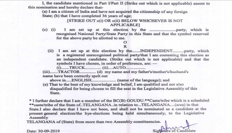 హుజుర్ నగర్ ఉప ఎన్నికలో మొత్తం 119 నామినేషన్లు దాఖలయ్యాయి. ఇందులో 64 రిజెక్ట్ అవ్వగా కేవలం 55మాత్రమే స్క్రూటినీ తరువాత అర్హత సాధించాయి. ఇందులో అభ్యర్థుల అఫిడవిట్లలో ఒక విషయం ఆశ్చర్యపరుస్తుంది.