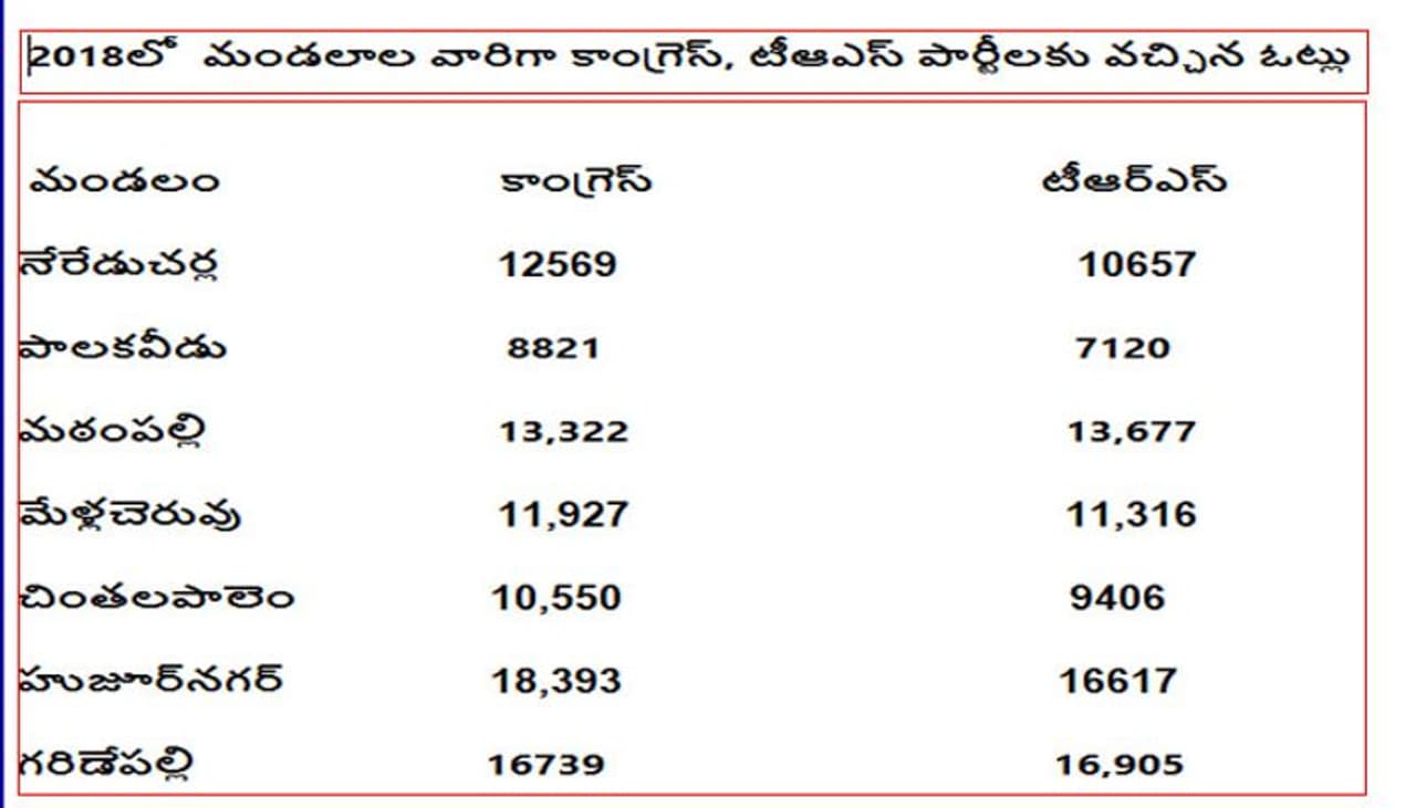 గత అసెంబ్లీ ఎన్నికల్లో నేరేడుచర్ల మంలంలో టీఆర్ఎస్ అభ్యర్ధి కంటే కాంగ్రెస్ అభ్యర్ధి ఉత్తమ్ కుమార్ రెడ్డికి 1902 ఓట్లు ఆధిక్యం లభించింది. పాలకవీడు(పాలకీడు)లో సైదిరెడ్డి కంటే ఉత్తమ్ కుమార్ రెడ్డి 1701 ఓట్లు, మేళ్లచెరువులో 611 ఓట్లు, చింతలపాలెంలో1144 ఓట్లు, హుజూర్నగర్లో 1776 ఓట్ల మెజారిటీ లభించింది. మఠంపల్లి, గరిడేపల్లి మండలాల్లో మాత్రమే టీఆర్ఎస్ కు ఆదిక్యత వచ్చింది. మఠంపల్లిలో కాంగ్రెస్ కంటే టీఆర్ఎస్ కు 355 ఓట్లు, గరిడేపల్లిలో166 ఓట్ల మెజారిటీ వచ్చింది.