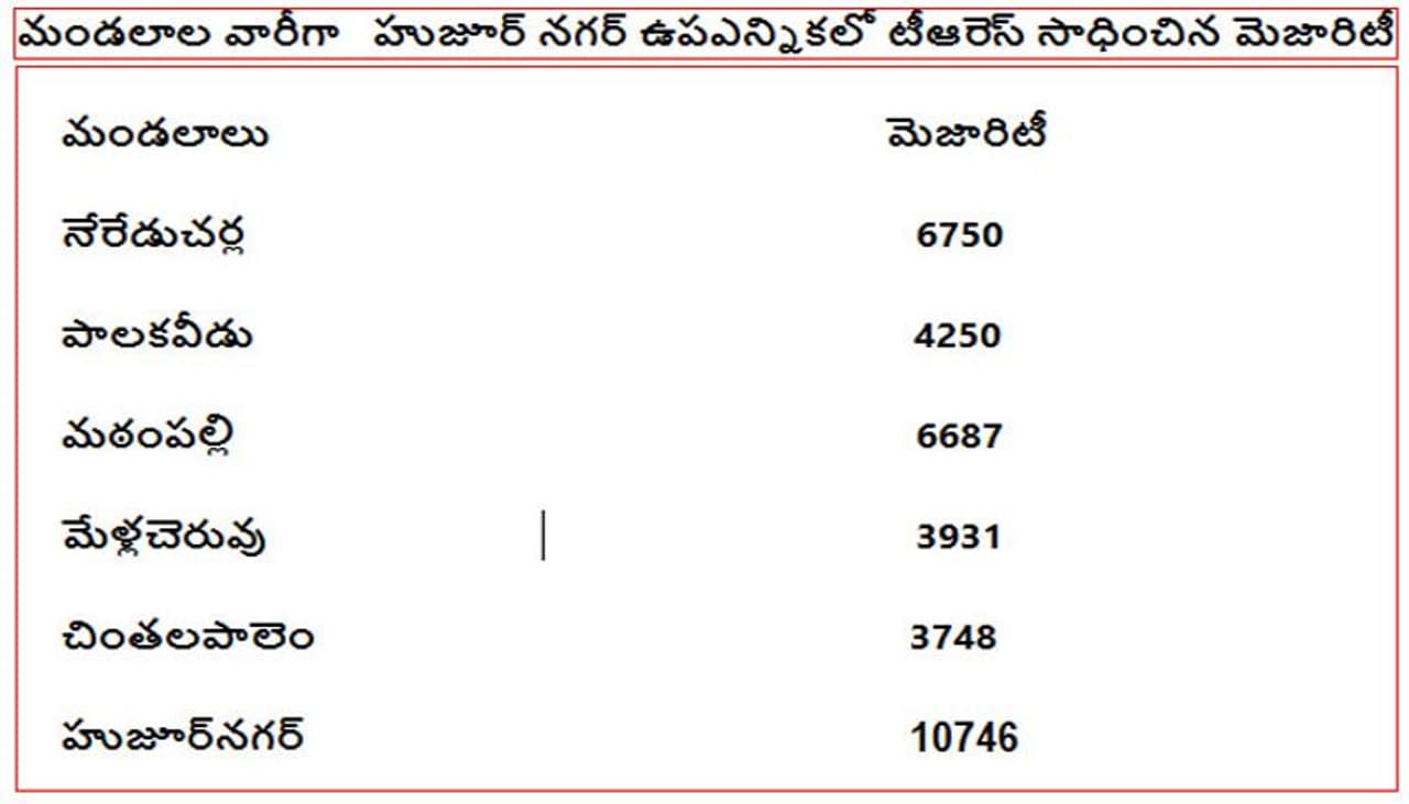 ఇక ఈ నెల 21న జరిగిన ఉప ఎన్నికల్లో టీఆర్ఎస్ అభ్యర్ధి సైదిరెడ్డికి ఏడు మండలాల్లో మెజారిటీ వచ్చింది. ఏ ఒక్క మండలంలో కూడ టీఆర్ఎస్ అభ్యర్ధిని మెజారిటీని కాంగ్రెస్ అడ్డుకోలేకపోయింది. ఈ ఎన్నికల్లో హుజూర్నగర్ మండలంలో టీఆర్ఎస్కు 10746 ఓట్లు, గరిడేపల్లిలో7172, నేరేడుచర్లలో6750 ఓట్లమెజారిటీ వచ్చింది.మఠంపల్లి మండలంలో6687 ఓట్లు, పాలకవీడు (పాలకీడు)లో 4250 ఓట్ల, మేళ్లచెర్వులో 3931 ఓట్లు, చింతలపాలెంలో3748 ఓట్ల మెజారిటీ దక్కింది.