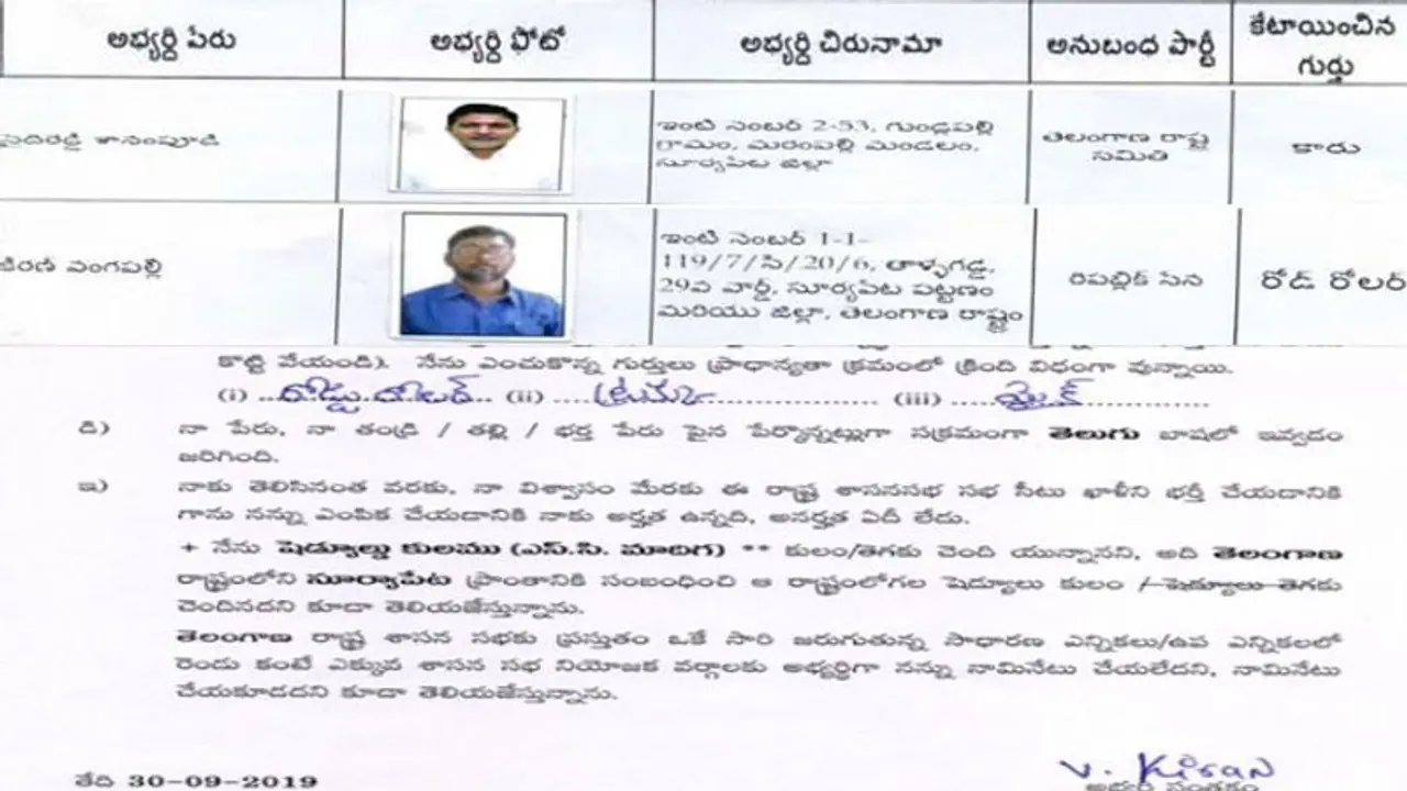 తన ఎలక్షన్ అఫిడవిట్ లో తనకు రోడ్డు రోలరు లేదా ట్రక్కు గుర్తు లేదా మైక్ గుర్తును కేటాయించవలిసిందిగా అభ్యర్థించాడు. ఎన్నికల కమిషన్ ఇతనికి రోడ్డు రోలరు గుర్తును కేటాయించింది. కావాలని కాంగ్రెస్ పార్టీ ఇలాంటి దొంగ రాజకీయాలు చేస్తుందని అధికార తెరాస ఆరోపిస్తుంది.