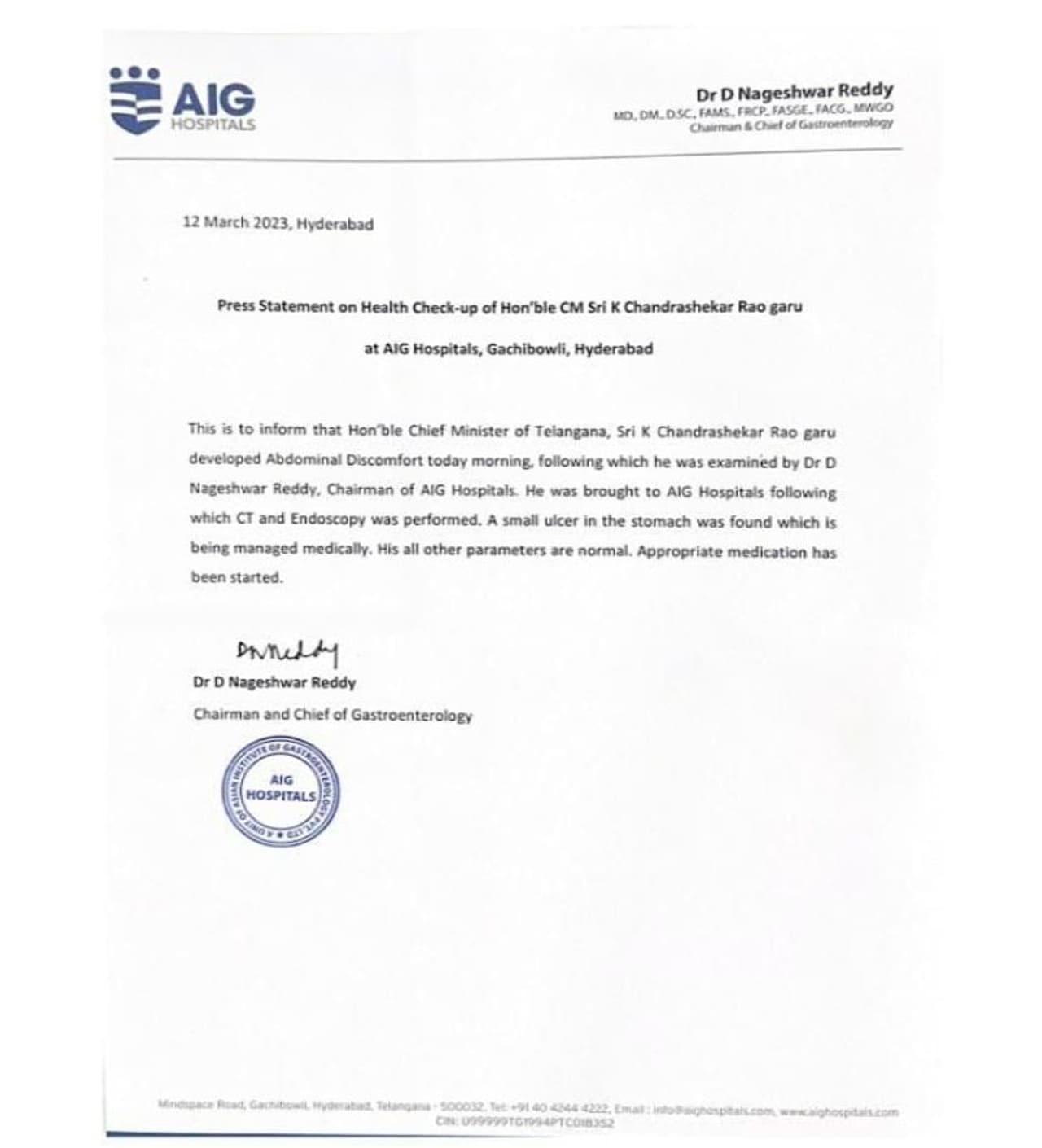‘‘తెలంగాణ ముఖ్యమంత్రి కేసీఆర్కు ఈరోజు ఉదయం పొత్తికడుపులో అసౌకర్యం ఏర్పడింది. ఏఐజీ హాస్పిటల్స్ చైర్మన్ డాక్టర్ డి నాగేశ్వర్ రెడ్డి కేసీఆర్ను పరీక్షించారు. ఆ తర్వాత ఆయనను ఏఐజీ ఆస్పత్రికి తీసుకురావడం జరిగింది. ఆస్పత్రిలో కేసీఆర్కు సీటీ, ఎండోస్కోపీ చేశారు. కడుపులో ఒక చిన్న అల్సర్క కనుగొనబడింది. అది మందులతో తగ్గిపోతుంది. ఆయన మిగిలిన అన్ని పారామిటర్స్ సాధారణంగా ఉన్నాయి. తగిన మెడికేషన్ ఇవ్వడం ప్రారంభించబడింది’’ అని ఏఐజీ ఆస్పత్రి పేర్కొంది.