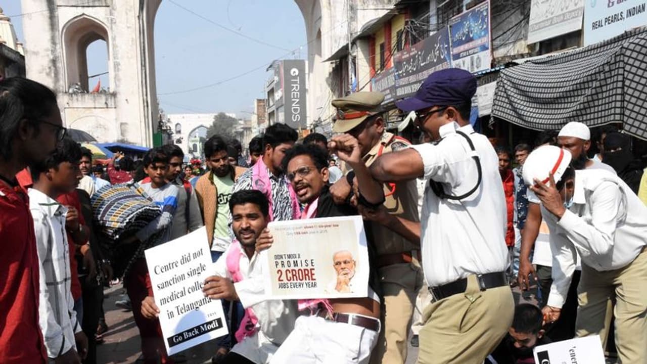 ఉస్మానియా యూనివర్సిటీలో తెలంగాణ రాష్ట్ర సమితి విద్యార్థి విభాగం (టీఆర్ఎస్వీ)కి చెందిన 50 మంది విద్యార్థులు నల్లజెండాలతో ప్రధాని పర్యటనకు వ్యతిరేకంగా నినాదాలు చేశారు. వెంటనే అంబర్పేట పోలీసులు వారిని అదుపులోకి తీసుకున్నారు. తెలంగాణకు కేంద్ర ప్రభుత్వం చేసిన బూటకపు వాగ్దానాలకు వ్యతిరేకంగా తాము నిరసన తెలుపుతున్నామని టీఆర్ఎస్వీ ప్రధాన కార్యదర్శి కరుణాకర్రెడ్డి అన్నారు. “పీఎం మోడీ 2014లో అధికారంలోకి వచ్చారు. ఇన్ఫర్మేషన్ టెక్నాలజీ ఇన్వెస్ట్మెంట్ రీజియన్ (ఐటిఐఆర్), రామగుండం ఫర్టిలైజర్స్ అండ్ కెమికల్స్ లిమిటెడ్ (ఆర్ఎఫ్సిఎల్) వంటి ప్రాజెక్టులను రాష్ట్రానికి వాగ్దానం చేసినప్పటికీ, ఏ అభివృద్ధి కూడా జరగలేదు. దీనికి వ్యతిరేకంగా మేము నిరసన తెలియజేస్తున్నాము” అని కరుణాకర్ రెడ్డి చెప్పినట్టు సియాసత్ నివేదించింది.