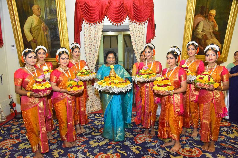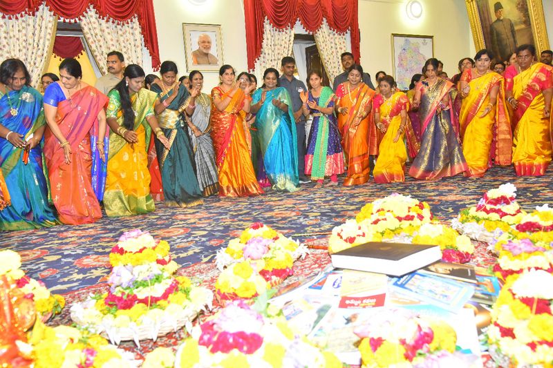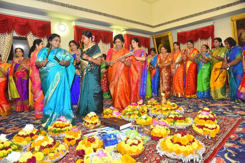 రాజ్ భవన్ ప్రాంగణంలో సోమవారం బతుకమ్మ సంబరాలు నిర్వహించారు. తెలంగాణ గవర్నర్ తమిళిసై సొందరరాజన్ ఈ వేడుకల్లో ఉత్సాహంగా పాల్గొన్నారు. స్వయంగా ఆమె బతుకమ్మను పేర్చి.. ‘‘ బతుకమ్మ బతుకమ్మ ఉయ్యాలో...’’ అంటూ పాట కూడా పాడటం విశేషం. అంతకు ముందు మహిళలందరికీ పండుగ శుభాకాంక్షలు తెలిపారు. సోమవారం అసెంబ్లీ ప్రాంగణంలో ఉద్యోగులు బతుకమ్మ ఉత్సవాలను ఘనంగా నిర్వహించారు.
