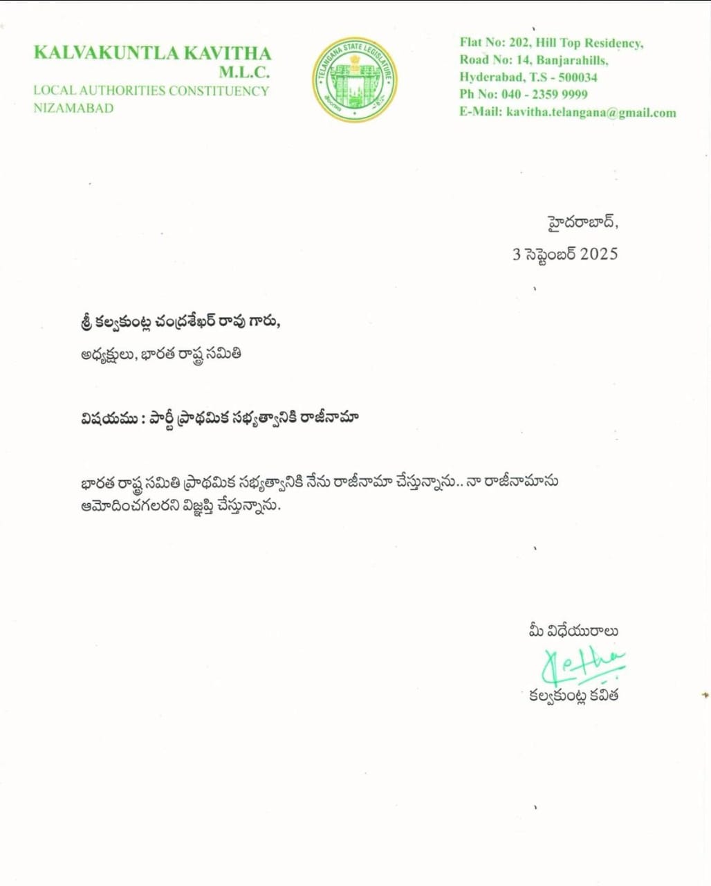 కల్వకుంట్ల కవిత బిఆర్ఎస్ పార్టీకి, ఎమ్మెల్సీ పదవికి రాజీనామా చేశారు.