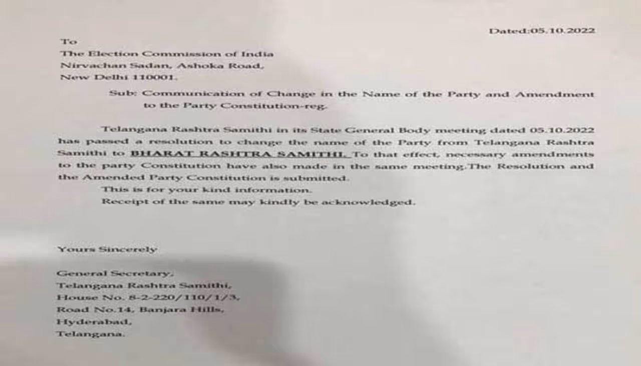టీఆర్ఎస్ విస్తృత స్థాయి సమావేశంలో పార్టీ పేరును మారుస్తూ తీర్మానం చేశారు. టీఆర్ఎస్ పేరును బీఆర్ఎస్ మారుస్తూ తీర్మానం ఏకగీవ్రంగా ఆమోదించారు.