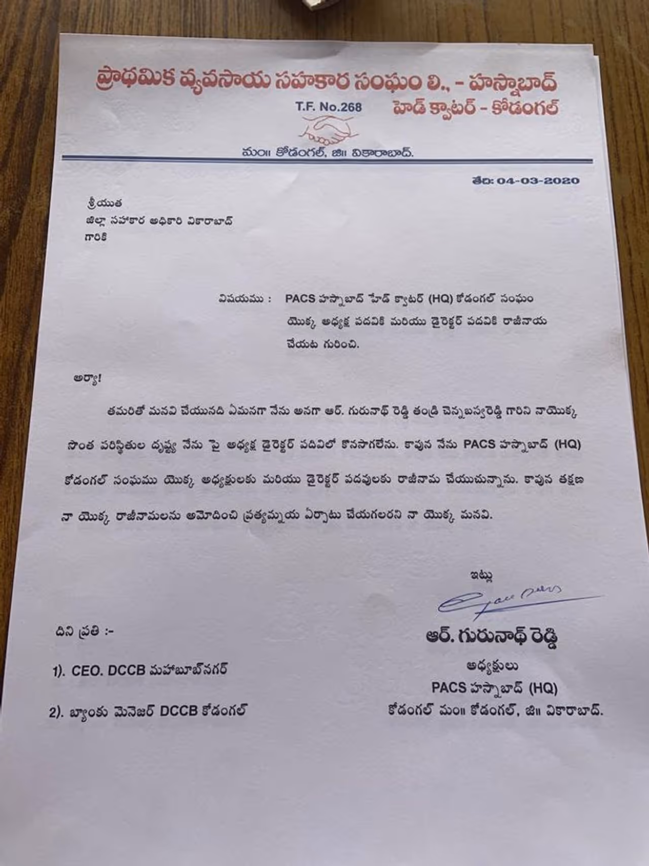 రైతులకు సేవ చేయాలన్న తన లక్ష్యం నెరవేరలేదన్నా ఆయన పార్టీలోనే కొనసాగుతానని రాజీనామా లేఖలో పేర్కొన్నారు. కాగా సహకరా సంఘాల ఎన్నికల్లోనూ టీఆర్ఎస్ హవా స్పష్టంగా కనిపించింది.