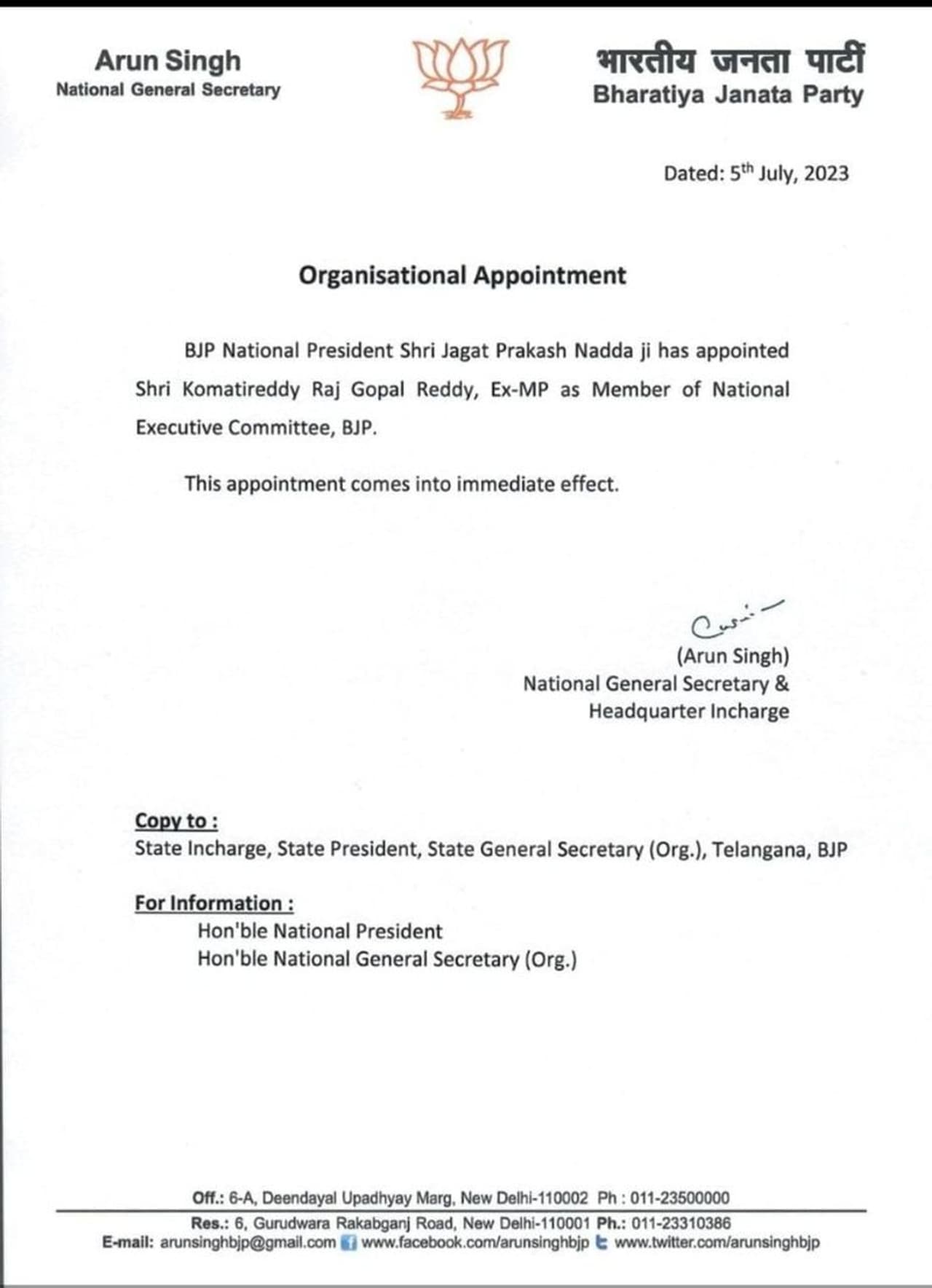 కోమటిరెడ్డి రాజగోపాల్ రెడ్డిని బీజేపీ జాతీయ కార్యవర్గ సభ్యుడిగా నియమిస్తూ ఆ పార్టీ ఉత్తర్వులు జారీ చేసింది. ఇప్పటికే తెలంగాణ బీజేపీ ఎన్నికల నిర్వహణ కమిటీ ఛైర్మన్గా ఈటల రాజేందర్ను నియమించిన సంగతి తెలిసిందే.