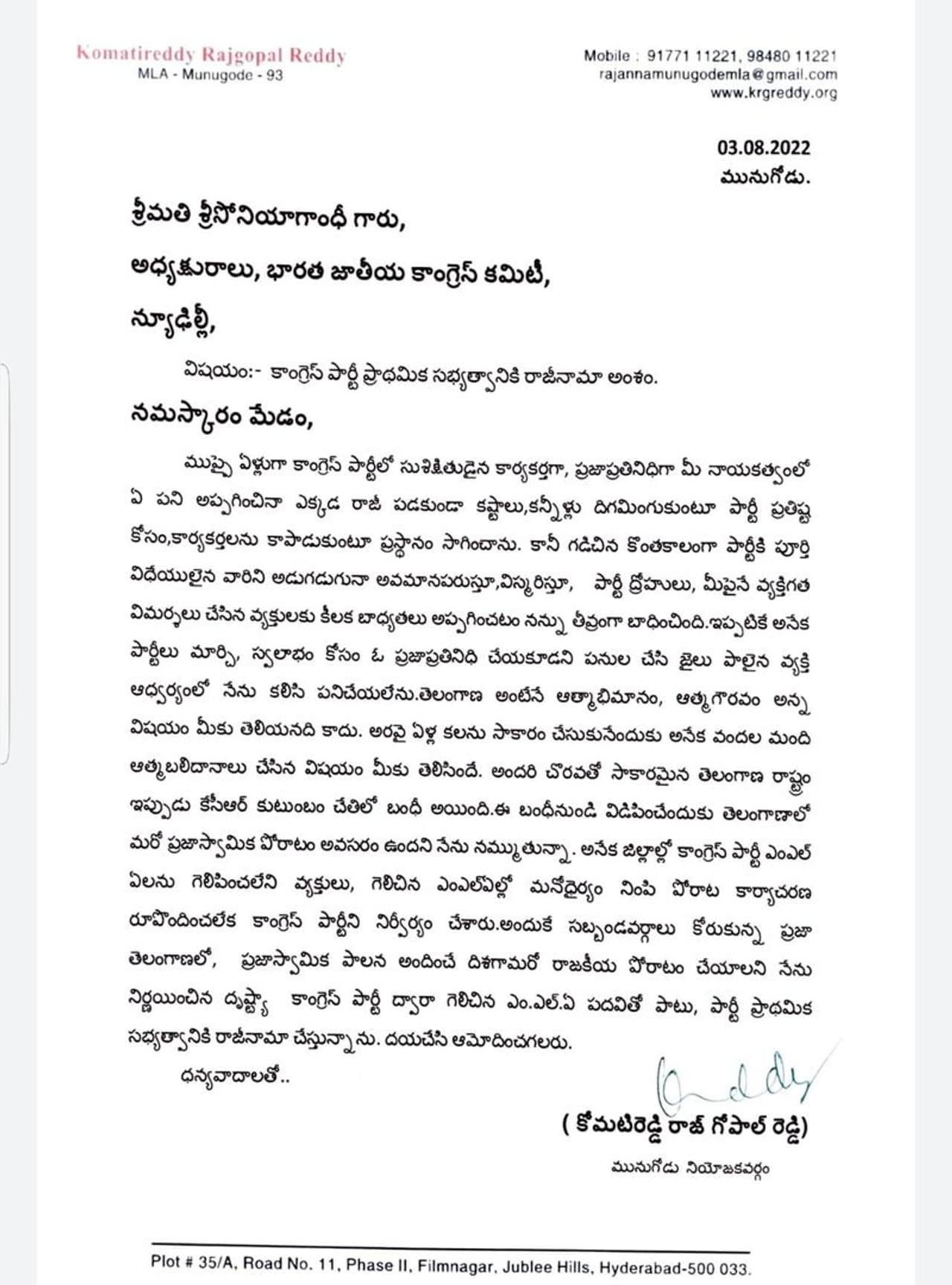 మీపైనే వ్యక్తిగత విమర్శలు చేసిన వ్యక్తికి కీలక బాధ్యతలు అప్పగించారని... ఇది తనను తీవ్రంగా బాధించిందని రాజగోపాల్ రెడ్డి ఆవేదన వ్యక్తం చేశారు. పార్టీకి విధేయులైన వారిని అడుగడుగునా అవమానపరుస్తున్నారని కోమటిరెడ్డి స్పష్టం చేశారు. మీ నాయకత్వంలో ఏ పని అప్పగించినా రాజీ లేకుండా కష్టపడ్డానని రాజగోపాల్ రెడ్డి గుర్తుచేశారు. కన్నీళ్లు, కష్టాలు దిగమింగుకుంటూ పార్టీలో పనిచేశానని ఆయన ఆవేదన వ్యక్తం చేశారు. అరవై ఏళ్ల కలను సాకారం చేసుకునేందుకు అనేక వందల మంది ఆత్మబలిదానాలు చేశారని.. కానీ తెలంగాణ రాష్ట్రం ఇప్పుడు కేసీఆర్ కుటుంబం చేతిలో బందీ అయ్యిందని రాజగోపాల్ రెడ్డి ఆరోపించారు. కాంగ్రెస్ పార్టీ ద్వారా గెలిచిన ఎమ్మెల్యే పదవికి, పార్టీ ప్రాథమిక సభ్యత్వానికి రాజీనామా చేస్తున్నాని .. దీనిని తక్షణం ఆమోదించాలని రాజగోపాల్ రెడ్డి కోరారు.