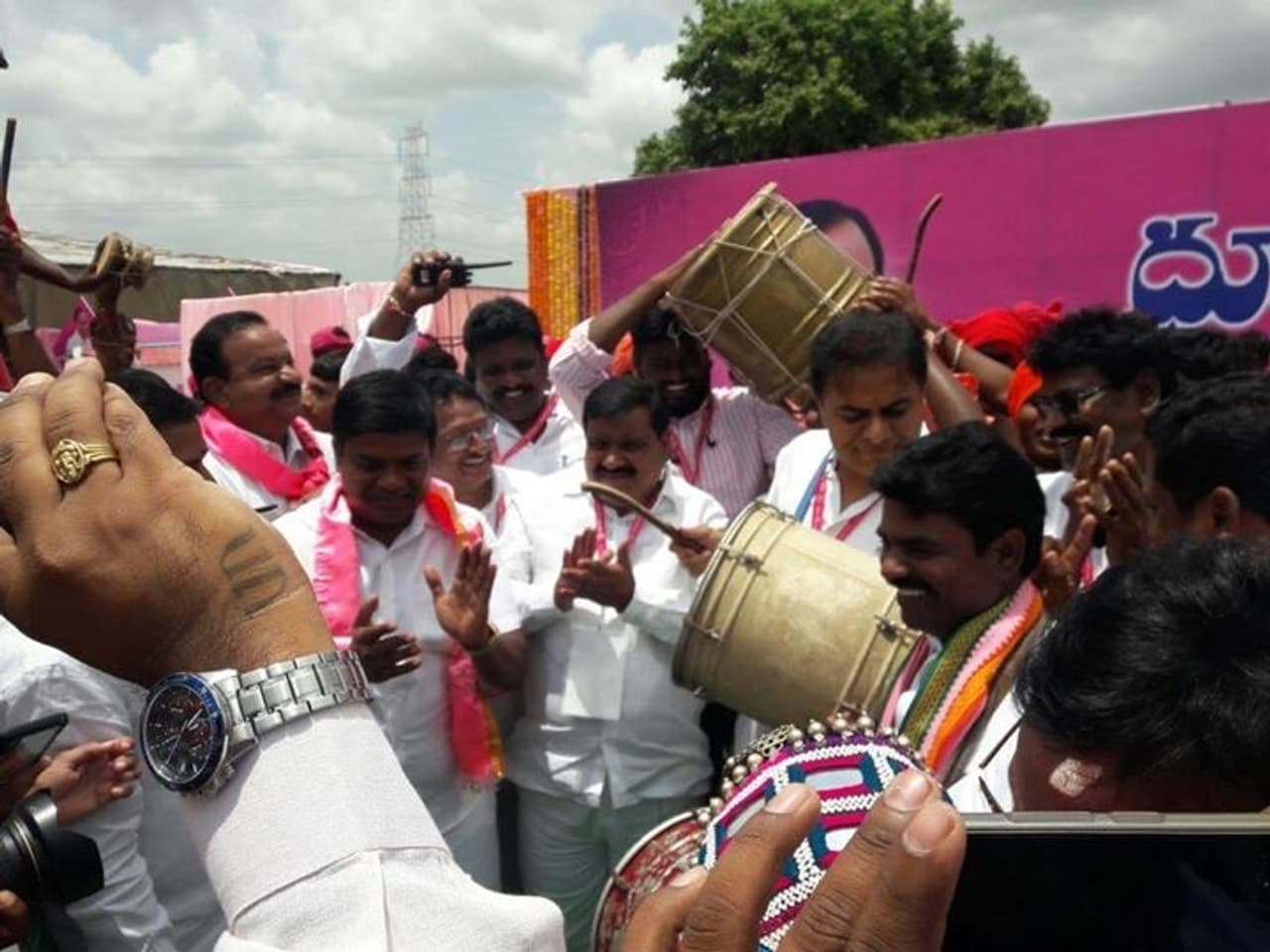 ప్రగతి నివేదన సభ: డప్పు కొట్టి ప్రజలకు అభివాదం చేస్తున్న కేటీఆర్ (ఫోటోలు)
