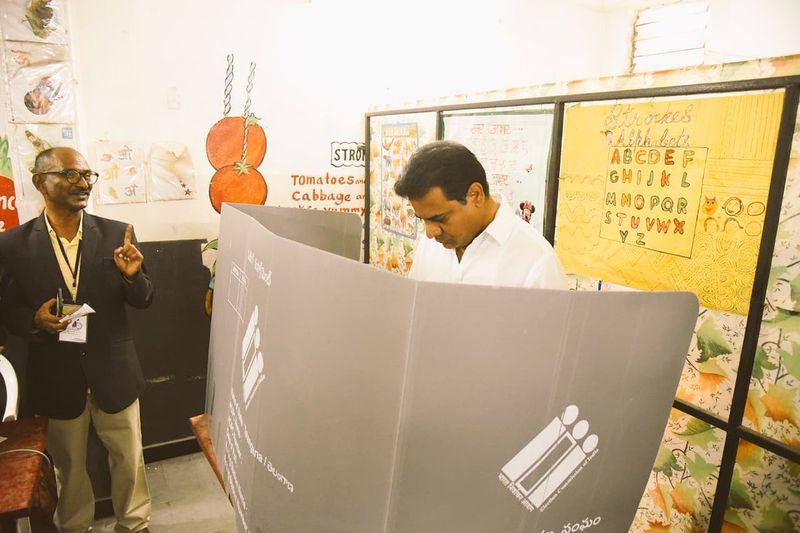 బంజారా హిల్స్ పోలింగ్ కేంద్రంలో ఓటేయడానికి కేటీఆర్ క్యూలో నిల్చున్నారు.అందరు ఓటర్ల మాదిరిగానే తన సమయం వచ్చే వరకు క్యూలో వేచివుండి ఓటేశారు. ఆయన సోదరి కవిత కూడా నిజామాబాద్ లో ఇదే మాదిరిగా క్యూలో నిల్చుని ఓటేశారు.
