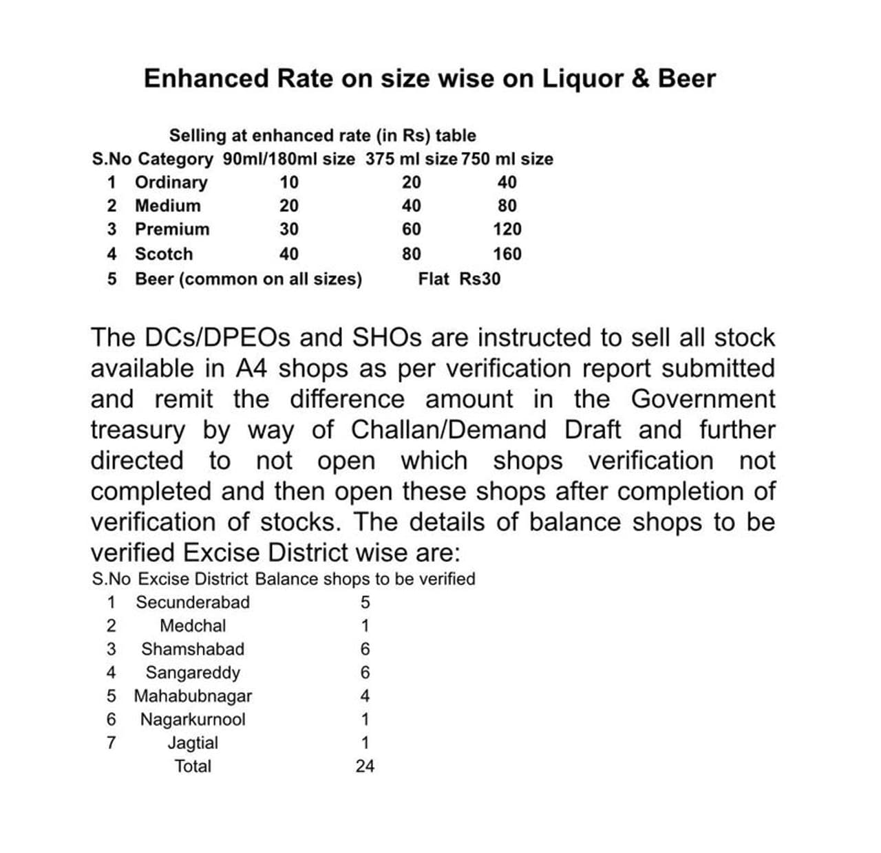 బీర్ పై 30 రూపాయాలు, చీప్ లిక్కర్ పుల్ బాటిల్ పై రూ.40లు పెంచారు. ఆర్డినరీ లిక్కర్ పుల్ బాటిల్ పై రూ.80లు అదనంగా వసూలు చేయనున్నారు. స్కాచ్ లిక్కర్ పుల్ బాటిల్ పై రూ. 160 అదనంగా పెరిగాయి.తెలంగాణ రాష్ట్రంలో మద్యం ధరలను పెంచుతూ రాష్ట్ర ప్రభుత్వం నిర్ణయం తీసుకొంది.