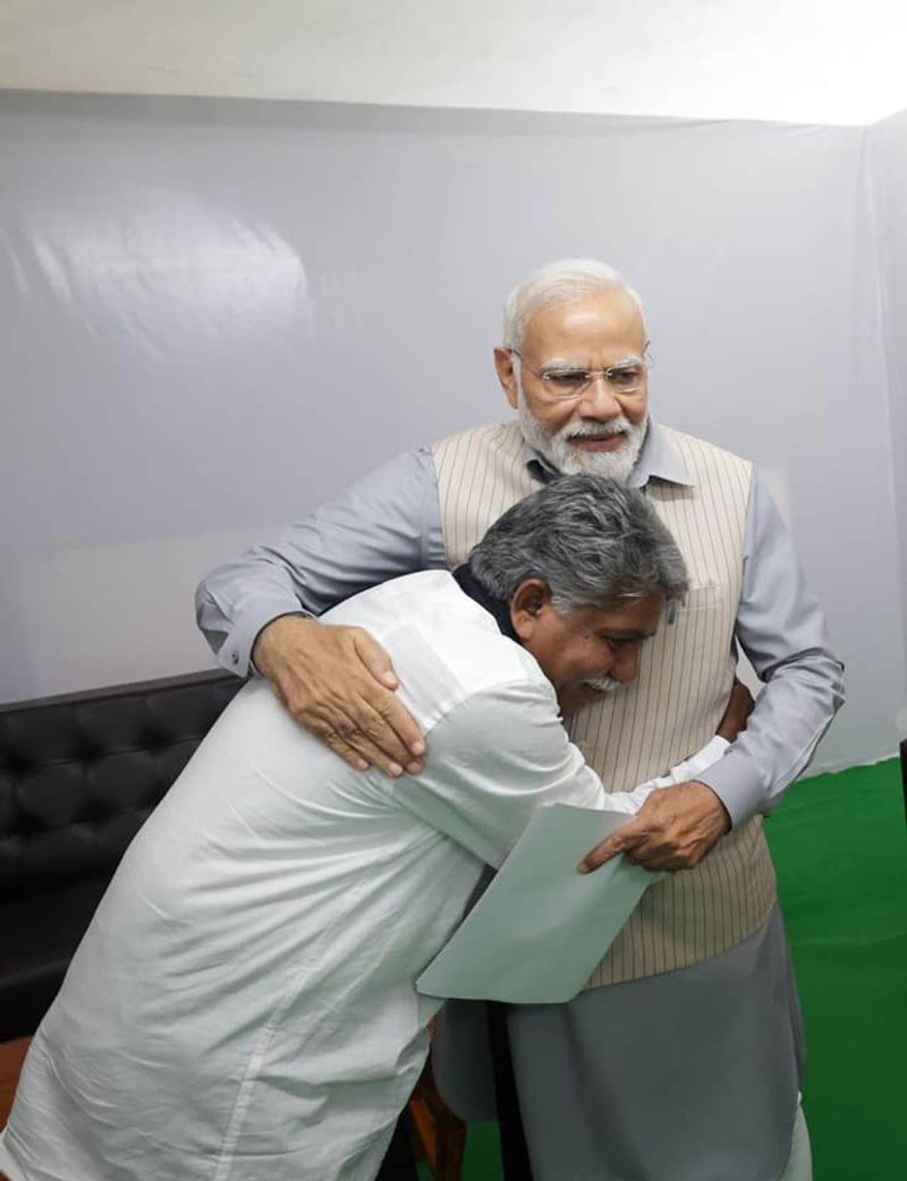 ప్రధానమంత్రి నరేంద్ర మోదీని మాదిగ రిజర్వేషన్ పోరాట సమితి వ్యవస్థాపకులు మందకృష్ణ మాదిగ కలిశారు. ఇటీవల ప్రధాని మోదీ తెలంగాణలోని వరంగల్లో పర్యటించిన సందర్భంలో ఈ ఘటన చోటుచేసుకుంది. ఈ సందర్భంగా మందకృష్ణ మాదిగను ప్రధాని మోదీ ఆత్మీయ ఆలింగనం చేసుకున్నారు. తాజాగా ఇందుకు సంబంధించి ఫొటోలు వెలుగులోకి వచ్చాయి. ప్రధాని మోదీని కలిసిన సందర్భంగా షెడ్యూల్డ్ కులాల(ఎస్సీ) వర్గీకరణ గురించి ప్రధాని మోదీ వద్ద మందకృష్ణ మాదిగ ప్రస్తావించినట్టుగా తెలిసింది.