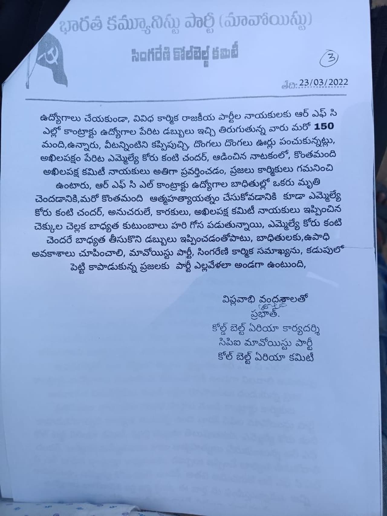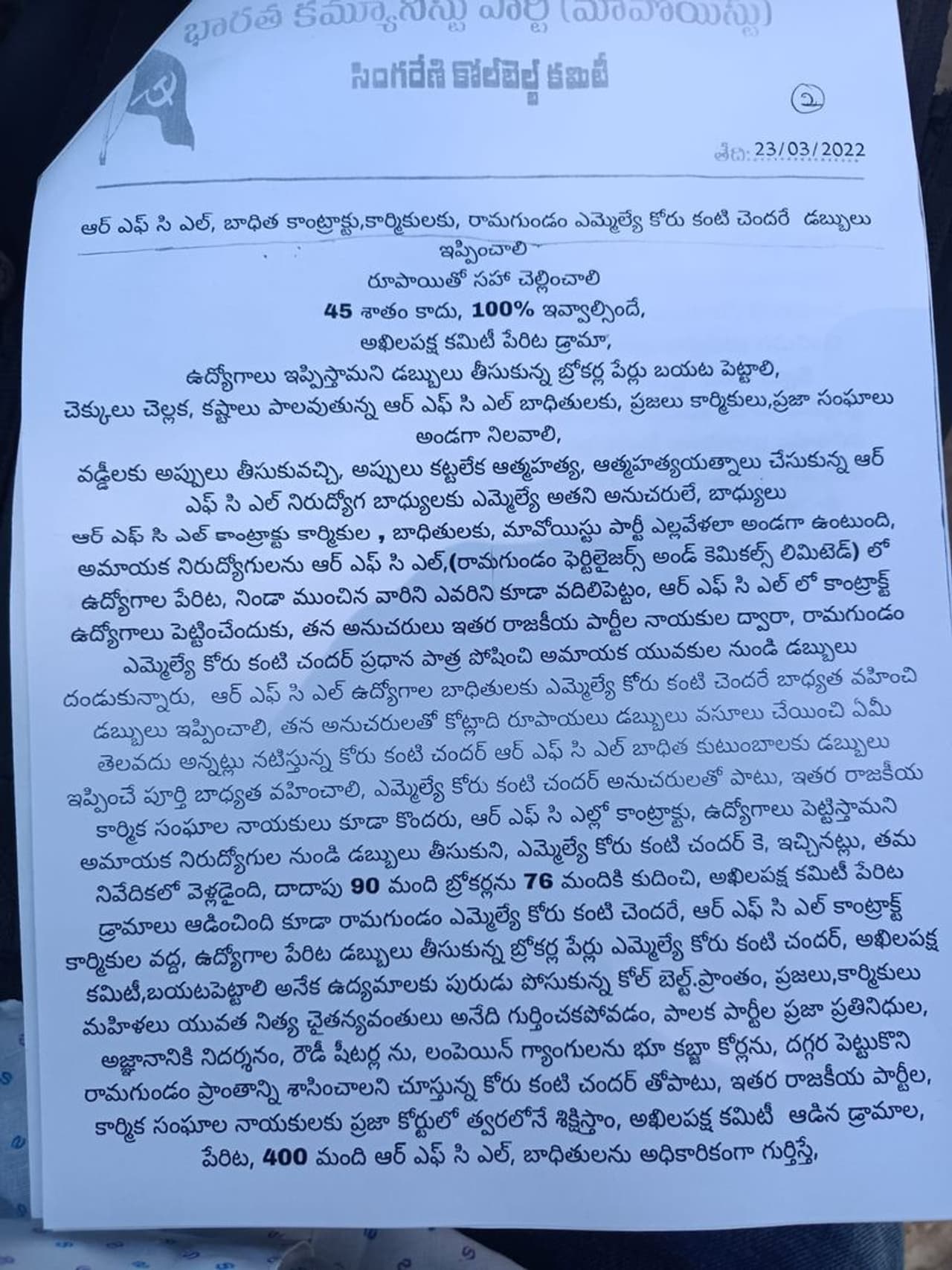 ఆర్ఎఫ్ సిఎల్ బాధితుల ఆత్మహత్యలకు ఎమ్మెల్యే, అతని అనుచరులే బాధ్యత వహించాలని మావోలు అన్నారు. ఉద్యోగాల పేరిట అమాయకులను నిండా ముంచిన ఎవ్వరినీ వదిలిపెట్టమని హెచ్చరించారు. ఎమ్మెల్యే అనుచరులు, కార్మిక సంఘాల నాయకులు వసూలు చేసిన డబ్బుల్లో చందర్ కు వాటా వుందన్నారు.90 మంది బ్రోకర్లను 76 కు కుదించి అఖిలపక్షం పేరిట డ్రామాలాడుతున్నారని మండిపడ్డారు.