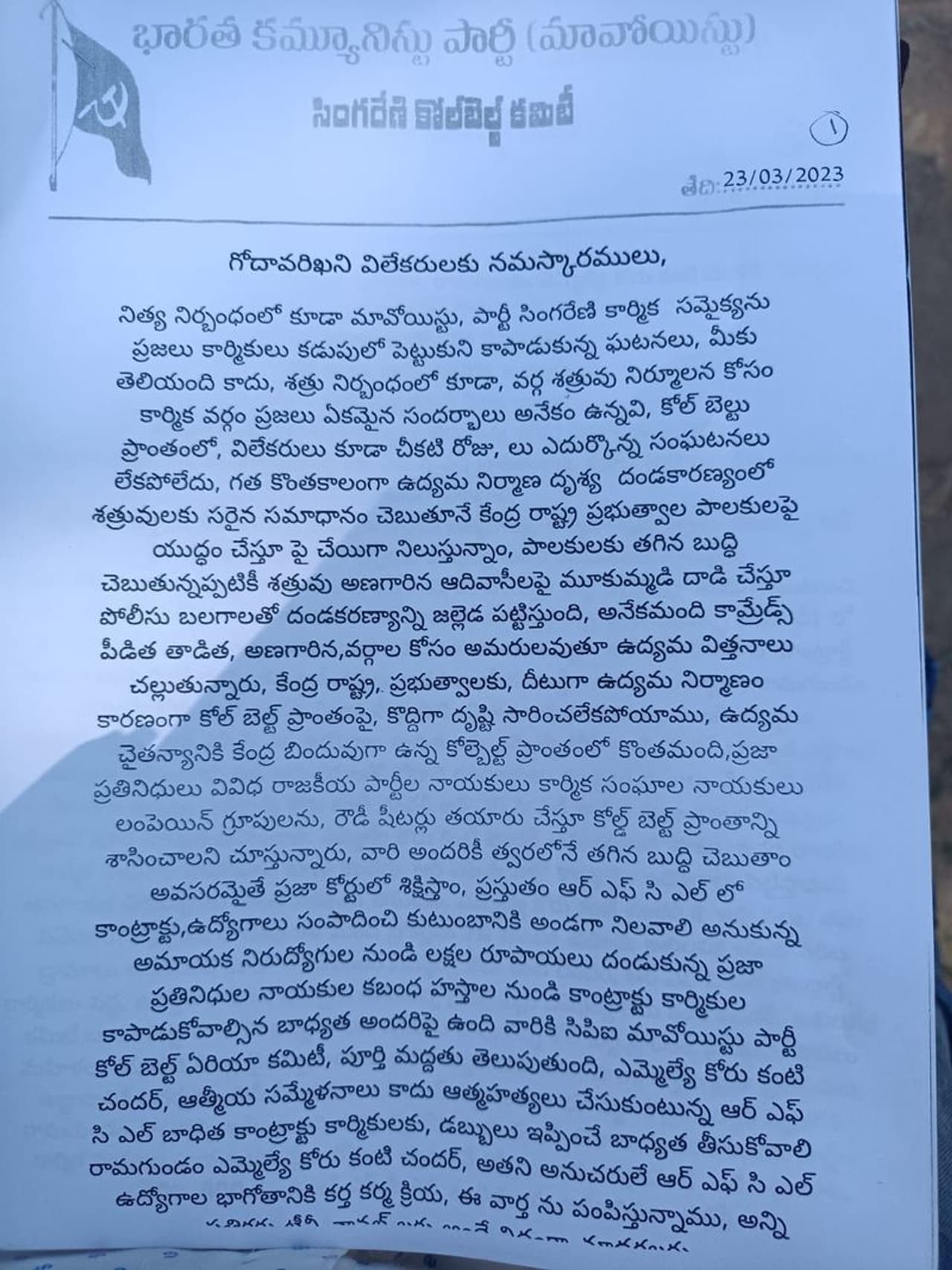 అధికార బిఆర్ఎస్ పార్టీ ఎమ్మెల్యే కోరుకంటి చందర్ ను ప్రజా కోర్టులో శిక్షిస్తామని హెచ్చరిస్తూ మావోయిస్టుల బహిరంగ లేఖ విడుదల చేసారు.