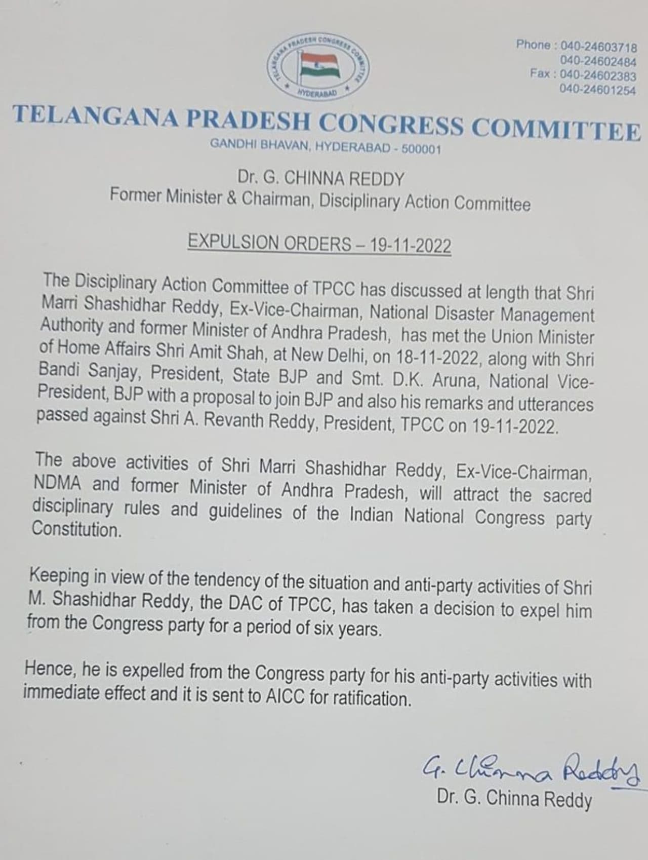 కాంగ్రెస్ పార్టీ నుంచి సీనియర్ నేత మర్రి శశిధర్ రెడ్డిని బహిష్కరిచారు. ఈ మేరకు టీపీసీసీ క్రమశిక్షణ కమిటీ నిర్ణయం తీసుకుంది.