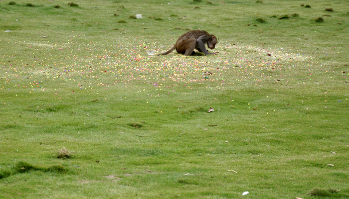 అడవులు తరగిపోవడం, పండ్ల చెట్లు లేకపోవడంతో జనావాసాలకు తరలి వచ్చిన కోతులు ఆహారం కోసం ఎన్ని ఇబ్బందులు పడుతున్నాయో చెప్పరాదు. వాటి బెడద గురించి అందరం బాధ పడుతాం గానీ వాటి మానాన అవి బతకడానికి మనం చేస్తున్నదేమీటో ఆలోచించం. ఆఖరికి అవి తెలిసీ తెలియక థర్మకోల్ బంతులను కూడా తింటున్నాయంటే పరిస్థితి ఎంతటి స్థాయిలో ఉందో ఊహించుకోవచ్చు.