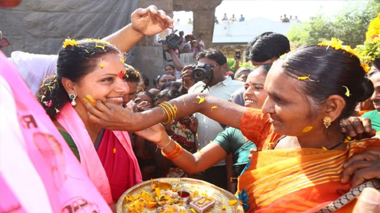 తెలంగాణ ఎన్నికల ప్రచారంలో భాగంగా జగిత్యాల మండలం జాబితా పూర్ లో నిజామాబాద్ ఎంపీ కల్వకుంట కవిత రోడ్ షో నిర్వహించారు. కాగా.. ఆమెకు మహిళలు మంగళ హారతులు తో ఘనస్వాగతం పలికారు. బొట్టుపెట్టి, గంధం రాసి.. ఆమెను ఆలింగనం చేసుకున్నారు. ఈ సందర్భంగా మహిళలు సెల్ఫీ లు తీసుకునేందుకు పోటీ పడ్డారు. మహిళలతో కలిసి కవిత బతుకమ్మ ఆడారు.
