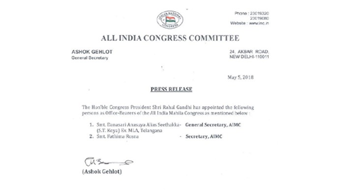 ఎఐసిసి ప్రధాన కార్యదర్శి, రాజస్థాన్ మాజీ ముఖ్యమంత్రి అశోక్ గెహ్లాట్ శనివారం సాయంత్రం ఈమేరకు సీతక్కను మహిళా కాంగ్రెస్ జాతీయ ప్రధాన కార్యదర్శిగా నియమిస్తూ ఆదేశాలు జారీ చేశారు. సీతక్కతోపాటు ఫాతిమా రొస్నా అనే నాయకురాలిని మహిళా కాంగ్రెస్ కార్యదర్శిగా నియమించారు.