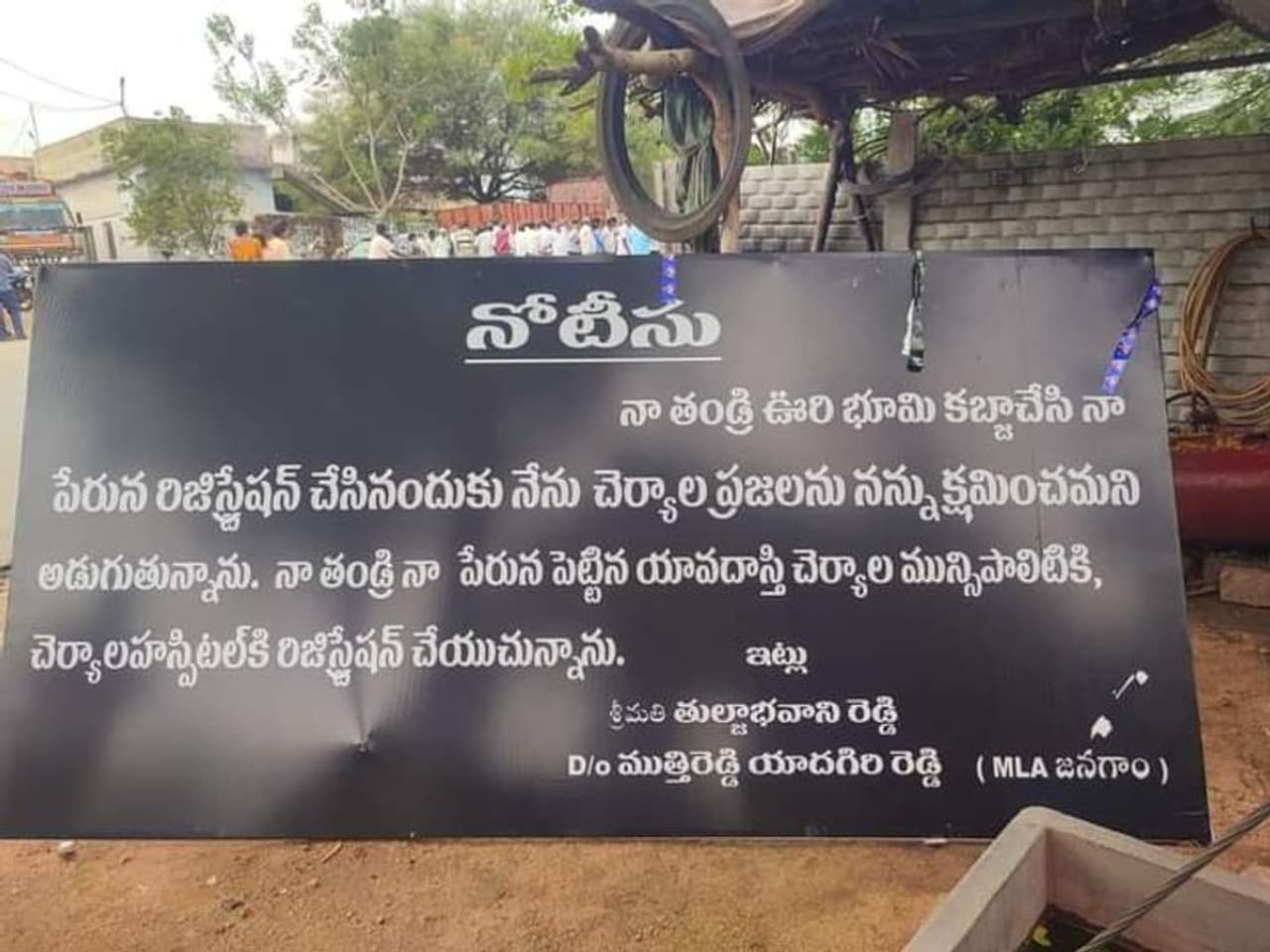 ‘‘నా తండ్రి ఊరి భూమి కబ్జా చేసి నా పేరు మీద రిజిస్ట్రేషన్ చేసినందుకు నేను చేర్యాల ప్రజలను నన్ను క్షమించమని అడుగుతున్నాను. నా తండ్రి నా పేరున పెట్టిన యావదాస్తి చేర్యాల మున్సిపాలిటికీ, హాస్పిటల్కు రిజిస్ట్రేషన్ చేయుచున్నాను’’ అని తుల్జా భవానీ రెడ్డి ఓ నోటీసును కూడా ప్రదర్శించారు.
