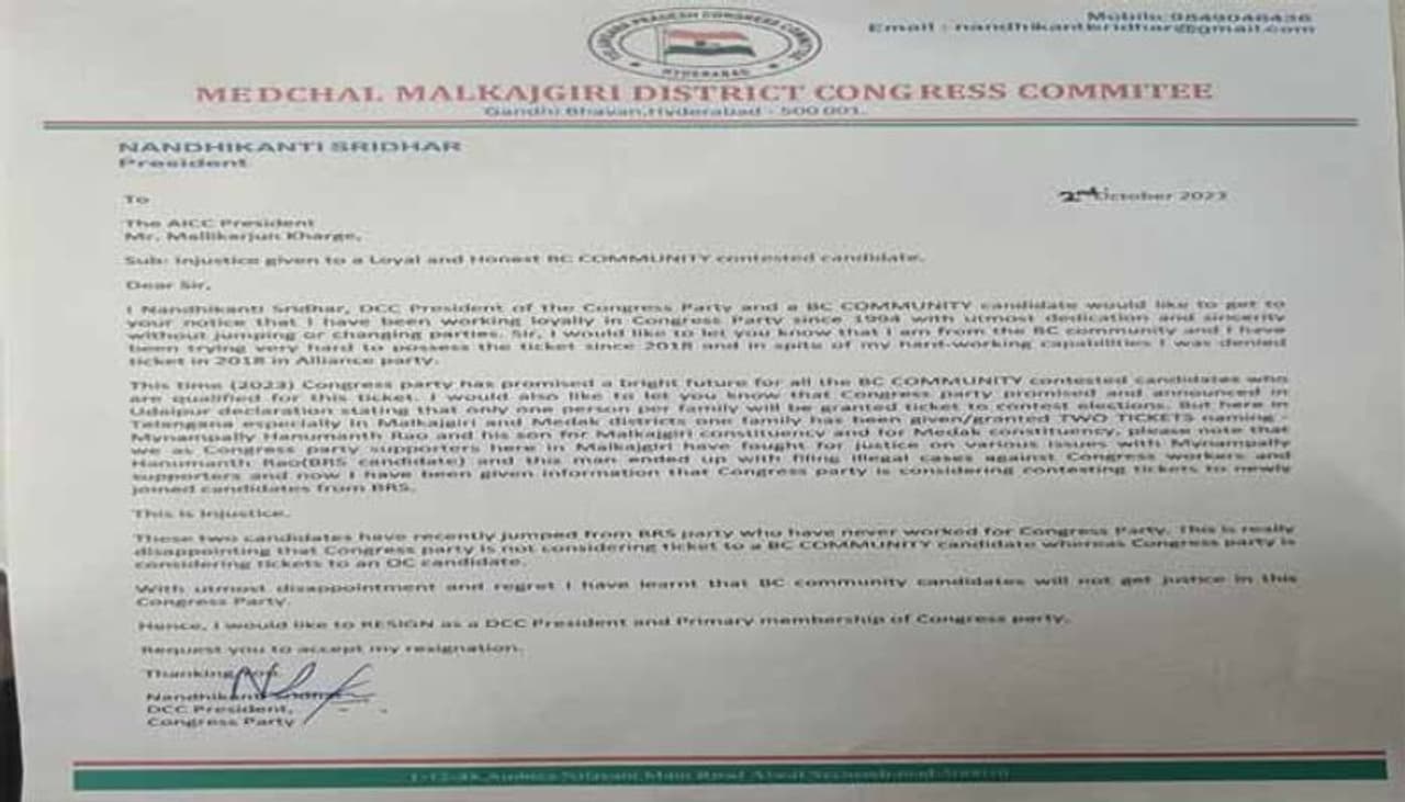 మేడ్చల్ మల్కాజిగిరి డీసీసీ అధ్యక్షుడు నందికంటి శ్రీధర్ కాంగ్రెస్ పార్టీకి రాజీనామా చేశారు. ఎఐసీసీ చీఫ్ మల్లికార్జున ఖర్గేకు రాజీనామా లేఖను పంపారు.