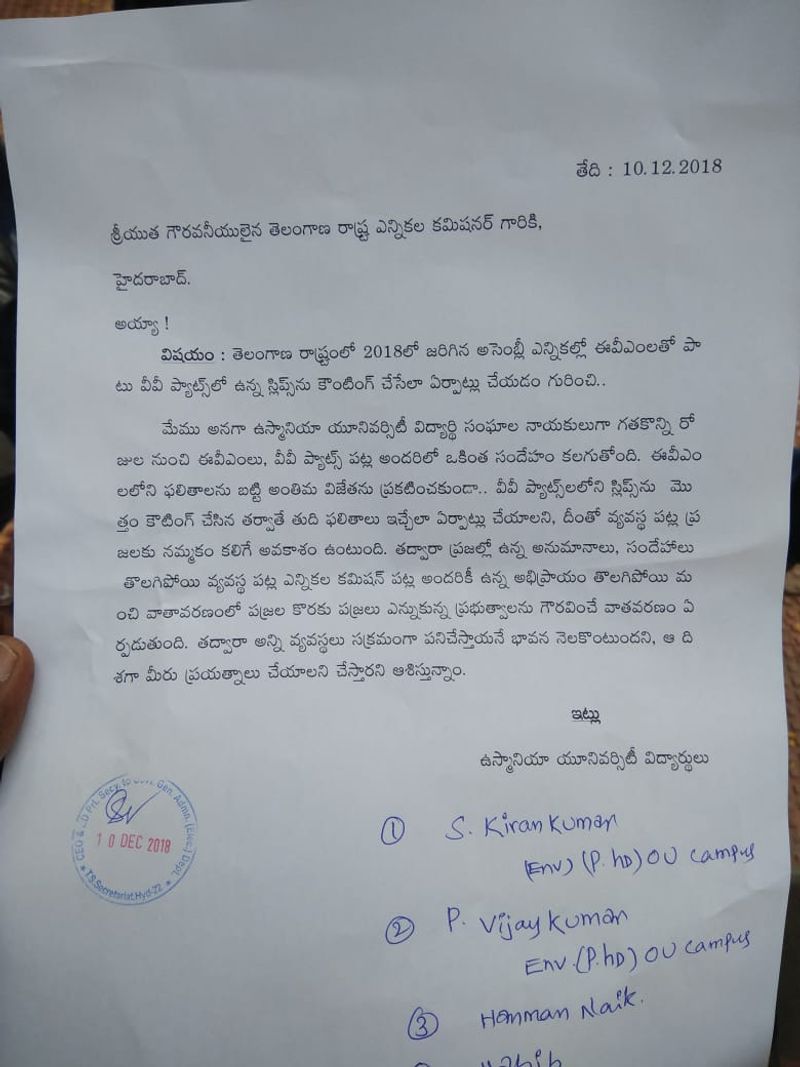 ఐదు రాష్ట్రాలతో పాటు తెలంగాణ లో కూడా ఎన్నికల ప్రక్రియ ప్రశాంతంగా ముగిసింది. పార్లమెంట్ ఎన్నికలరకు ముందు సెమిఫైనల్ గా భావిస్తున్న ఈ ఎన్నికలపై సర్వత్రా ఉత్కంఠ నెలకొంది. అయితే ఈవీఎం యంత్రాలపై తమకు సమ్మకం లేదని...వివిపాటులోని ఓటర్ స్లిప్ లను కూడా లెక్కించాలని కొందరు అభ్యర్థులు ఇప్పటికే ఈసీని కోరారు. తాజాగా అదే అనుమానాన్ని వ్యక్తపరుస్తూ ఉస్మానియా యూనివర్సిటీ విద్యార్థులు కూడా ఈసీకి ఓ బహిరంగ లేఖ రాశారు.