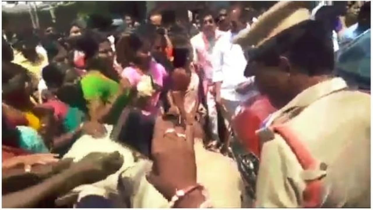 తెలంగాణలో అధికార టిఆర్ఎస్ పార్టీకి చెందిన మునుగోడు ఎమ్మెల్యే కూసుకుంట్ల ప్రభాకర్ రెడ్డికి స్థానికులు షాక్ ఇచ్చారు. సోమవారం పలు అభివృద్ధి పనులకు భువనగిరి ఎంపి డాక్టర్ బూర నర్సయ్య గౌడ్, స్థానిక ఎమ్మెల్యే కూసుకుంట్ల ప్రభాకర్ రెడ్డి శంకుస్థాపన చేయడానికి వచ్చారు. ఈ సందర్భంగా సొంత పార్టీకి చెందిన స్థానిక సర్పంచ్ పందుల నర్సింహ్మ తన కు సమాచారం ఇవ్వ లేదని ఆగ్రహం వ్యక్తం చేశారు. ఈ సందర్భంగా ఎమ్మెల్యే కారు ముందు పడుకుని నిరసన తెలిపారు. సర్పంచ్ కు మద్దతుగా స్థానిక ప్రజలు, మహిళలు ఎమ్మెల్యే కారుకు అడ్డంగా పడుకుని ఘెరావ్ చేశారు.