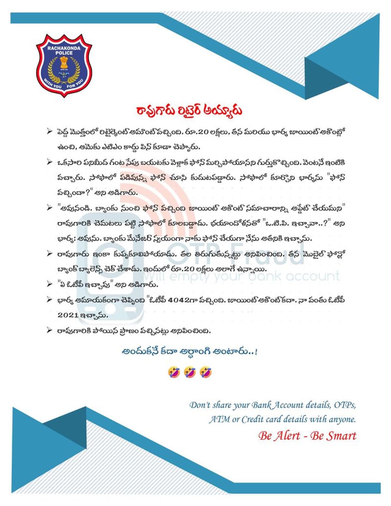 తాజాగా రాచకొండ పోలీసులు కాస్త ఫన్ జోడించి ఇలాంటి సైబర్ నేరాలపై అవగాహన కల్పించే ప్రయత్నం చేసారు. ఓ అర్థాంగి అమాయకత్వం సైబర్ కేటుగాళ్ల నుండి ఎలా కాపాడిందో తెలియజేస్తూ సాగిన చిన్న ఫన్నీ స్టోరీని రాచకొండ పోలీస్ కమీషనరేట్ అధికారిక ఎక్స్ మాధ్యమంలో పోస్ట్ చేసారు. ఈ స్టోరీ హాస్యాన్ని అందిస్తూనే ఆలోచింపజేసేలా వుంది. చివరగా బ్యాంక్ అకౌంట్ డిటెయిల్స్, ఓటిపి, ఏటిఎం పిన్, క్రెడిట్, డెబిట్ కార్టుల వివరాలు ఎవరికీ ఇవ్వొదని రాచకొండ పోలీసులు జాగ్రత్తలు చెప్పారు.