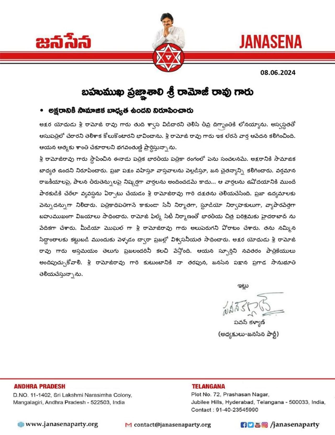 అక్షరానికి సామాజిక బాధ్యత ఉందని రామోజీరావు నిరూపించారని జనసేన అధినేత పవన్ కల్యాణ్ కొనియాడారు. అక్షరయోధుడు రామోజీరావు తుదిశ్వాస విడిచారని తెలిసి తీవ్ర దిగ్భ్రాంతికి లోనయ్యానంటూ ఓ పత్రిక ప్రకటన విడుదల చేశారు. రామోజీరావు ఆత్మకు శాంతి కలగాలని భగవంతుడిని ప్రార్థించారు. రామోజీరావు స్థాపించిన ఈనాడు పత్రిక భారతీయ పత్రికా రంగంలో పెను సంచలనమేనని కొనియాడారు. ప్రజా పక్షం వహిస్తూ వాస్తవాలను వెల్లడిస్తూ, జన చైతన్యాన్ని కలిగించారని కీర్తించారు. ప్రజా ఉద్యమాలకు వెన్నుదన్నుగా నిలిచారని గుర్తుచేశారు. రామోజీ ఫిల్మ్ సిటీ నిర్మాణంతో భారతీయ చిత్ర పరిశ్రమకు హైదరాబాద్ను వేదికగా చేశారన్నారు.