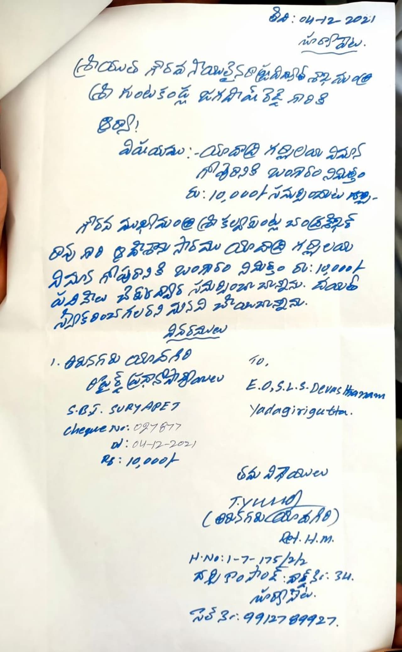 సూర్యాపేట : Yadadri గర్భాలయా విమాన గోపురానికి రెండు గ్రాముల బంగారాన్ని విరాళంగా సమర్పించి తన ఔదార్యం చాటుకున్నాడు ఓ retired employee. ఈ మేరకు మంత్రి Jagdish Reddyకి పదివేల రూపాయల చెక్ అందజేశాడు.