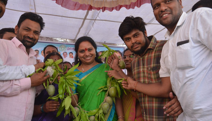 రాష్ట్ర వ్యాప్తంగా గురువారం ప్రారంభమయిన రైతు బంధు పథకంను జగిత్యాల నియోజకవర్గంలో కవిత ప్రారంభించారు. గుల్లపేట్ కు వెళ్లిన సందర్భంగా రైతులు ఇలా ఎంపి కల్వకుంట్ల కవిత పట్ల తమ అభిమానాన్ని చాటారు. తాటి ముంజలు, వెల్లుల్లి తో తయారు చేసిన హారాన్ని గౌడ రైతులు కవిత మెడలో వేశారు. సారంగాపూర్ మండలం లచ్చక్కపేట గ్రామంలో మొక్కజొన్న కంకులతో తయారు చేసిన దండను రైతులు వేశారు. రాయికల్ మండలం ఒడ్డె లింగాపూర్ గ్రామంలో మామిడి కాయలు దండ వేసి మామిడి రైతులు తమ అభిమానం చాటుకున్నారు.