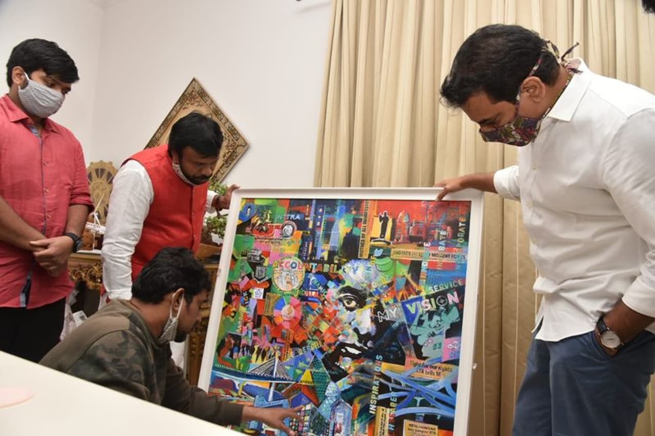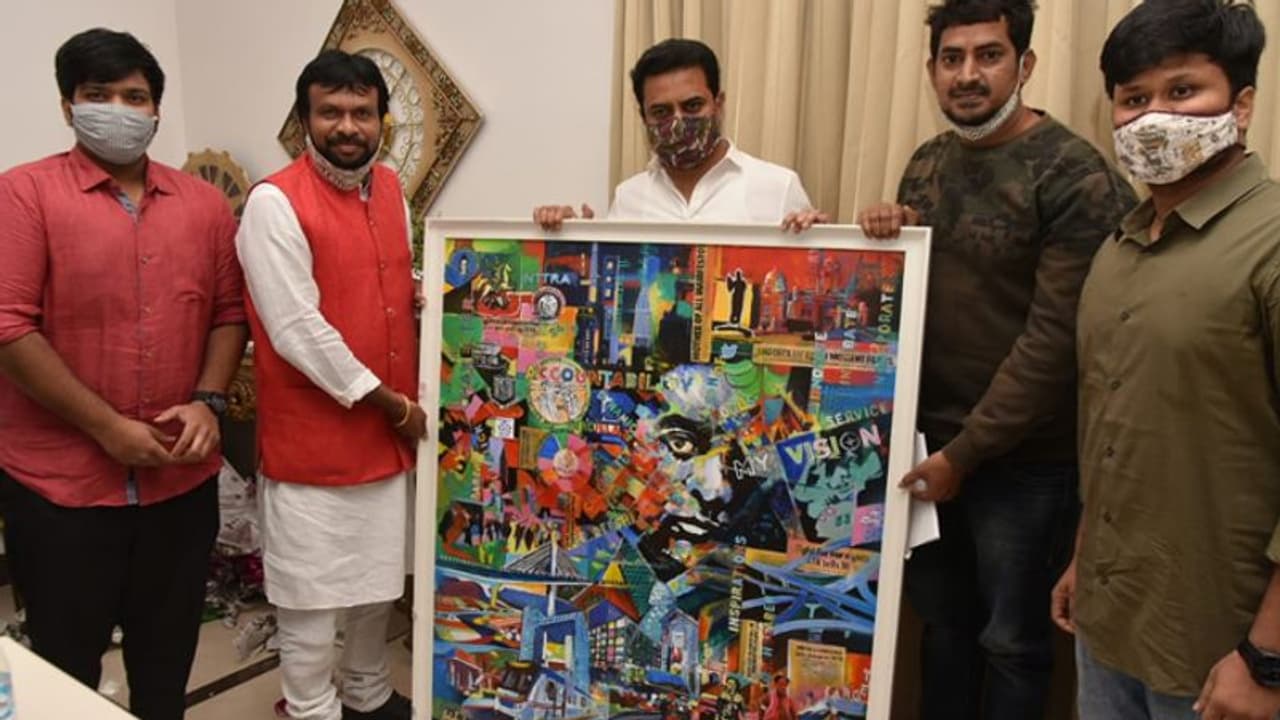 కేటీఆర్ బాల్యం, విద్యాభ్యాసం, పొలిటికల్ కెరియర్, విజయాలు, ప్రపంచవ్యాప్తంగా చేసిన పర్యటనలు, ప్రజల కోసం చేసిన పోరాటాలు, హైదరాబాద్ను విశ్వనగరంగా తీర్చిదిద్దడంలో చేసిన కృషిని వివరిస్తున్న దృశ్యమాలికలతో శ్రీనివాస్ ఓ పెయింటింగ్ను వేయించారు. సామాజిక అంశాలపై పెయింటింగ్స్ వేసే కందుకూరి వెంకటేశ్ దీనిని వేశారు.