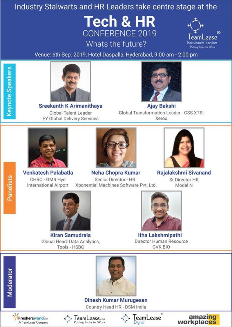 ప్రముఖ ఉద్యోగ నియామకాల సంస్థ టీమ్ లీజ్ భవిష్యత్తులో టెక్ మరియు మానవ వనరులు అన్న అంశంపై ఈ నెల ఆరో తేదీన హైదరాబాద్ హోటల్ దసపల్లాలో సదస్సు నిర్వహించనుంది. ఉద్యోగుల జీవిత చక్రంలో నియామకం, ఆన్ బోర్డింగ్ మరియు శిక్షణ, పరిహారం, ప్రయోజనాలు, నిష్క్రమణ తదితర అంశాల విషయంలో సాంకేతిక పరిజ్ఞానం సాయపడుతుందని సంస్థ ప్రతినిధులు తెలిపారు