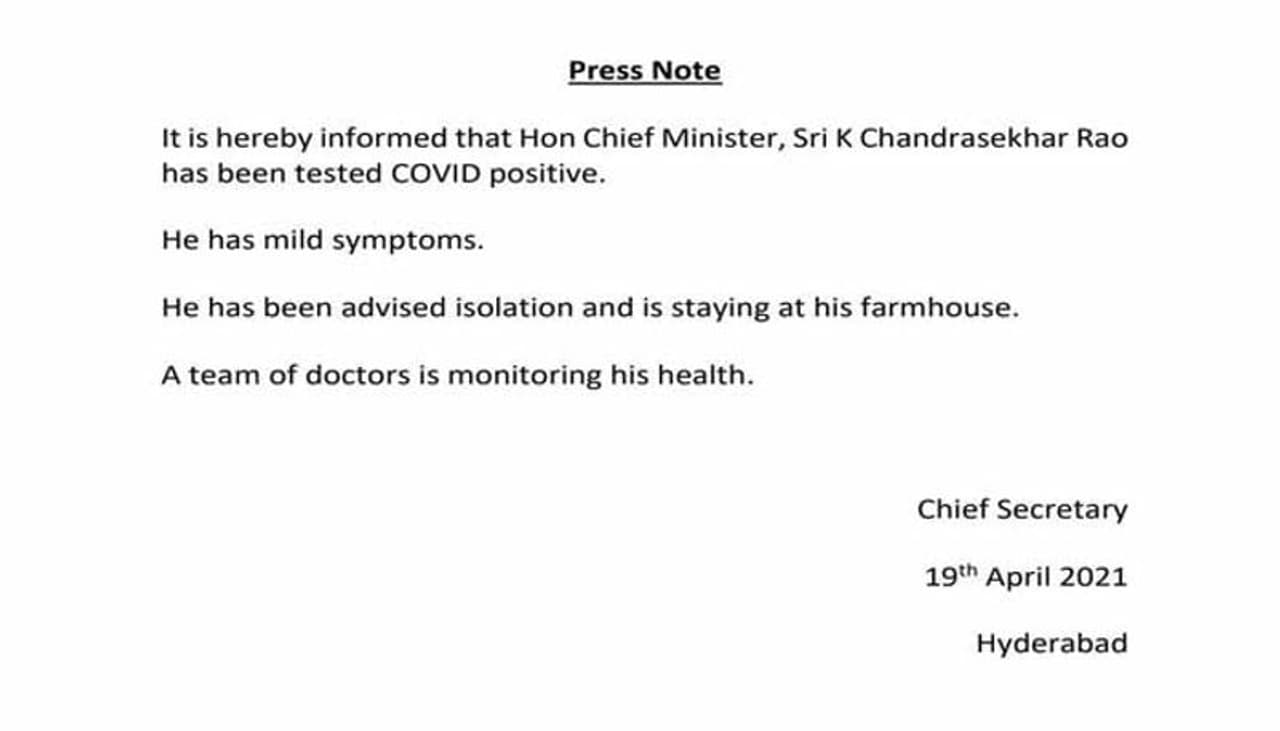 తెలంగాణ సీఎం కేసీఆర్కి కరోనా సోకింది. ప్రస్తుతం ఆయన హోం ఐసోలేషన్ లో ఉన్నాడు.
