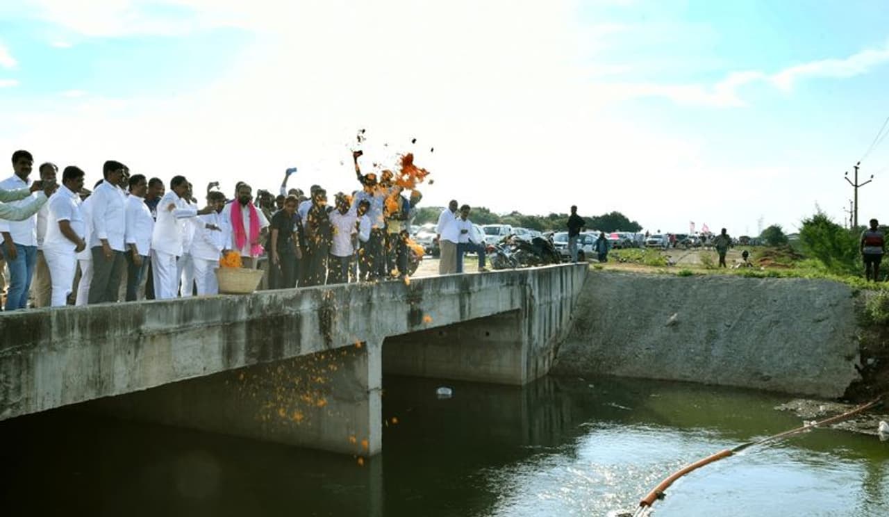 ఆ వెంటనే కాన్వాయ్ని ఆపించిన సీఎం అక్కడికక్కడే ఆగి కారు దిగి పెన్పహాడ్ మండలానికి తరలి వెడుతున్న నీళ్లను చూసి ఆగి పరిశీలించారు.300 కిలో మీటర్ల దూరం నుండి సూర్యపేట జిల్లా చివరి అంచు వరకు పరుగులు పెడుతున్న గోదావరి జలాలను పుష్పాలు జల్లి పూజలు నిర్వహించారు.