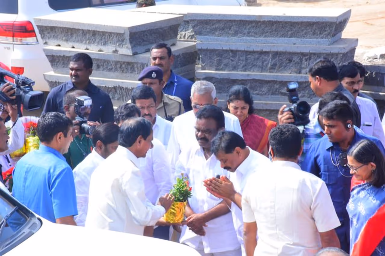 యాదాద్రి: యాదాద్రి పర్యటనలో భాగంగా ముఖ్యమంత్రి కేసీఆర్ రోడ్డు మార్గాన యాదాద్రికి చేరుకున్నారు. ముఖ్యమంత్రి కేసీఆర్ కు మంత్రి జగదీష్ రెడ్డితోపాటు, ఆలయ నిర్వాహకులు, ఇతర ప్రజాప్రతినిధులు, అధికారులు ఘన స్వాగతం పలికారు.