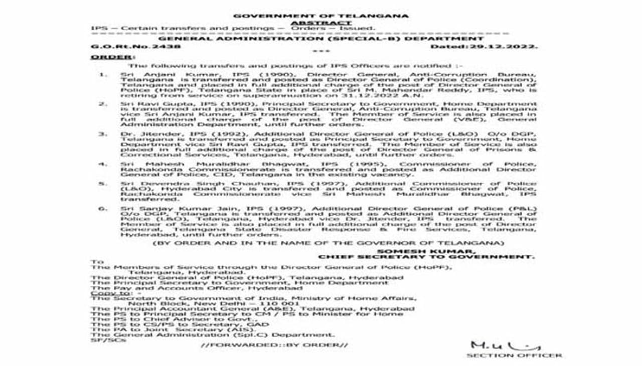ఏసీబీ డీజీపీగా రవిగుప్తాను తెలంగాణ సర్కార్ నియమించింది. రాచకొండ సీపీగా డీఎస్ చౌహన్ ను నియమించింది ప్రభత్వం. శాంతిభద్రతల డీజీగా సంజయ్ కుమార్ జైన్ ను ప్రభుత్వం నియమించింది. తెలంగాణ అగ్నిమాపక శాఖ డీజీగా జితేందర్ లను నియమిస్తూ ప్రభుత్వం నిర్ణయం తీసుకుంది.