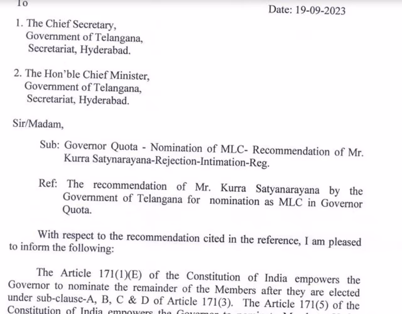గవర్నర్ కోటా కింద ఎమ్మెల్సీ అభ్యర్థిత్వం కోసం రాష్ట్ర ప్రభుత్వం పంపిన రెండు పేర్లను గవర్నర్ తిరస్కరించారు