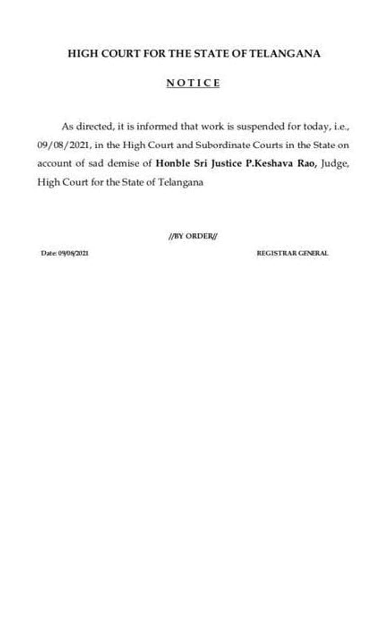 తెలంగాణ హైకోర్ట్ జడ్జ్ కేశవరావు మృతి పట్ల ముఖ్యమంత్రి కేసీఆర్ సంతాపం తెలిపారు. అలాగే ఆయన మృతికి సంతాపంగా హైకోర్ట్ సహా రాష్ట్రంలోని కోర్టులన్నింటికి సెలవు ప్రకటించారు.